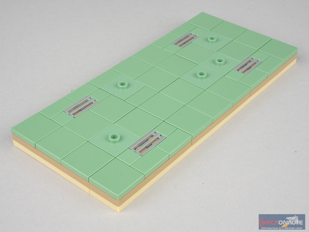 Nous continuons avec le socle d’exposition. Et comme vous pouvez vous en douter, ce n’est pas l’étape de construction la plus passionnante. On assemble une grande base noire, décorée sur 3 côtés de tiles noires également. On y ajoute une « estrade » de couleur light royal blue (vue récemment dans le set 10298 Vespa 125), sur laquelle on aperçoit deux réservations qui serviront à fixer la table de travail. On remarquera, malheureusement, une différence de teinte entre les éléments bleus. Un défaut récurrent, et plutôt gênant, d’autant plus dans un set dédié aux collectionneurs.