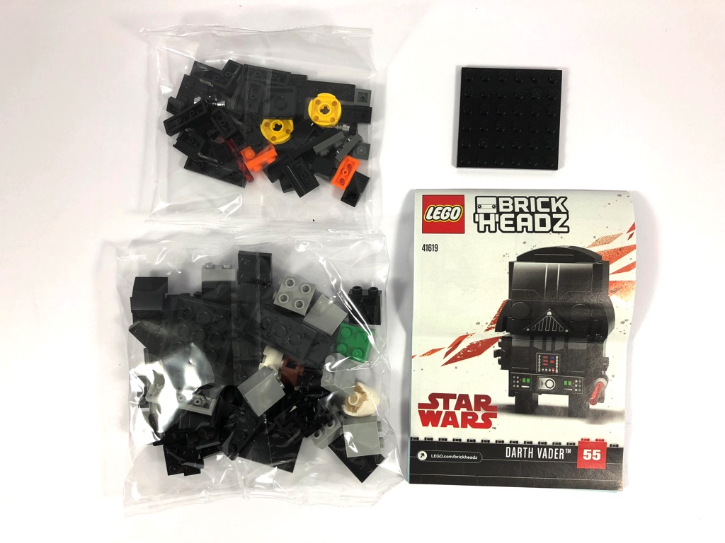 Le format et le style de la boîte sont identiques à ceux du set 41620 – Stormtrooper. On y trouve sur la face avant Dark Vador vu de face, sur un fond blanc ponctué de motifs géométriques rouges. Dans la partie inférieure, on trouve son numéro de BrickHeadz : 55. Sur le côté, nous trouvons une photo du Seigneur Noir tel qu’il apparaît dans la trilogie originale, tandis que sur l’arrière il est présenté sur son socle d’exposition aux côtés du set 41620 – Stormtrooper.