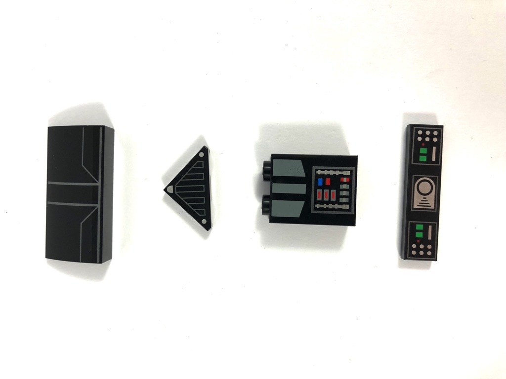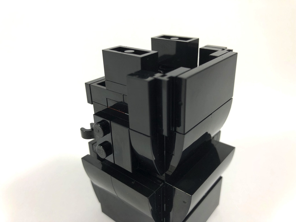 La suite est également assez intéressante. On construit le premier côté du casque, et on s’aperçoit que grâce au décalage obtenu précédemment, un vide subsiste entre la « calotte » du casque et le masque de Vador, tout comme dans le film. C’est très joliment fait. On construit ensuite la face, principalement décorée de deux pièces tampographiées : une grande slope pour le « front », et une pour le respirateur de forme triangulaire. Les yeux sont en toute logique de petites round tiles noires.
