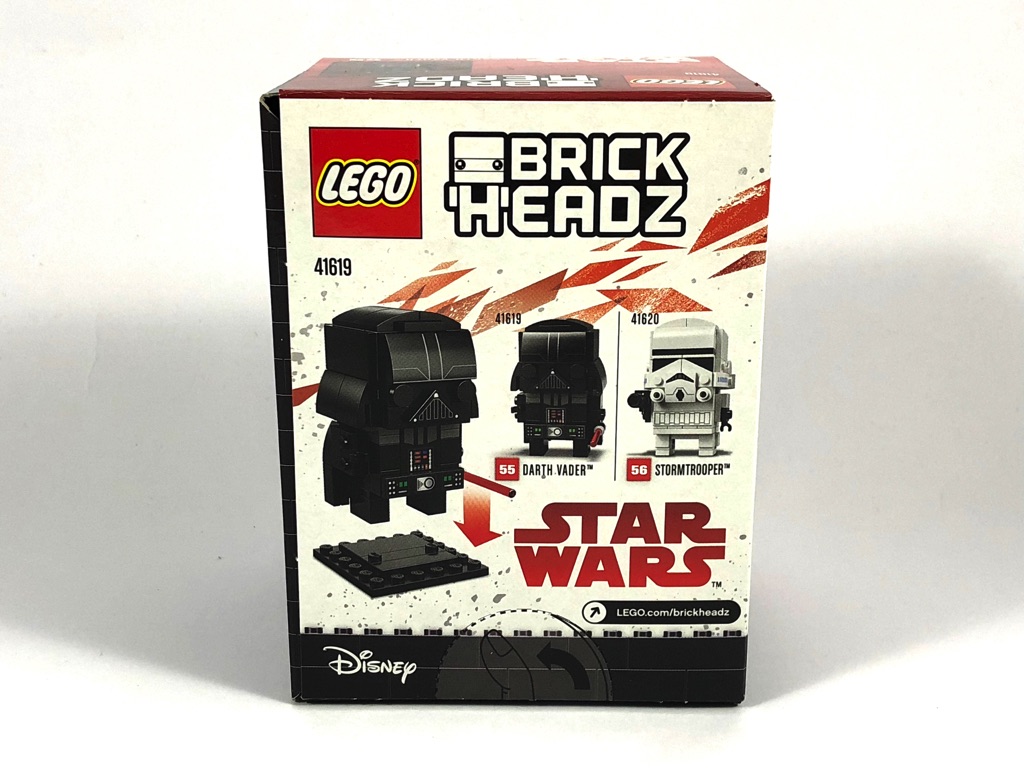 Le format et le style de la boîte sont identiques à ceux du set 41620 – Stormtrooper. On y trouve sur la face avant Dark Vador vu de face, sur un fond blanc ponctué de motifs géométriques rouges. Dans la partie inférieure, on trouve son numéro de BrickHeadz : 55. Sur le côté, nous trouvons une photo du Seigneur Noir tel qu’il apparaît dans la trilogie originale, tandis que sur l’arrière il est présenté sur son socle d’exposition aux côtés du set 41620 – Stormtrooper.