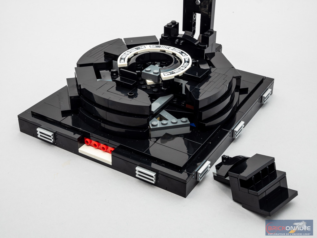 Sur une plate de forme ronde, on construit le siège de Dark Vador. il est entouré de 3 briques incurvées 3×3, jusqu’ici inédites en noir. On fixe ce siège sur la turntable centrale de la structure. On termine cette étape avec les 3 panneaux de commande : il s’agit de 3 tiles « macaroni », couvertes d’un autocollant.