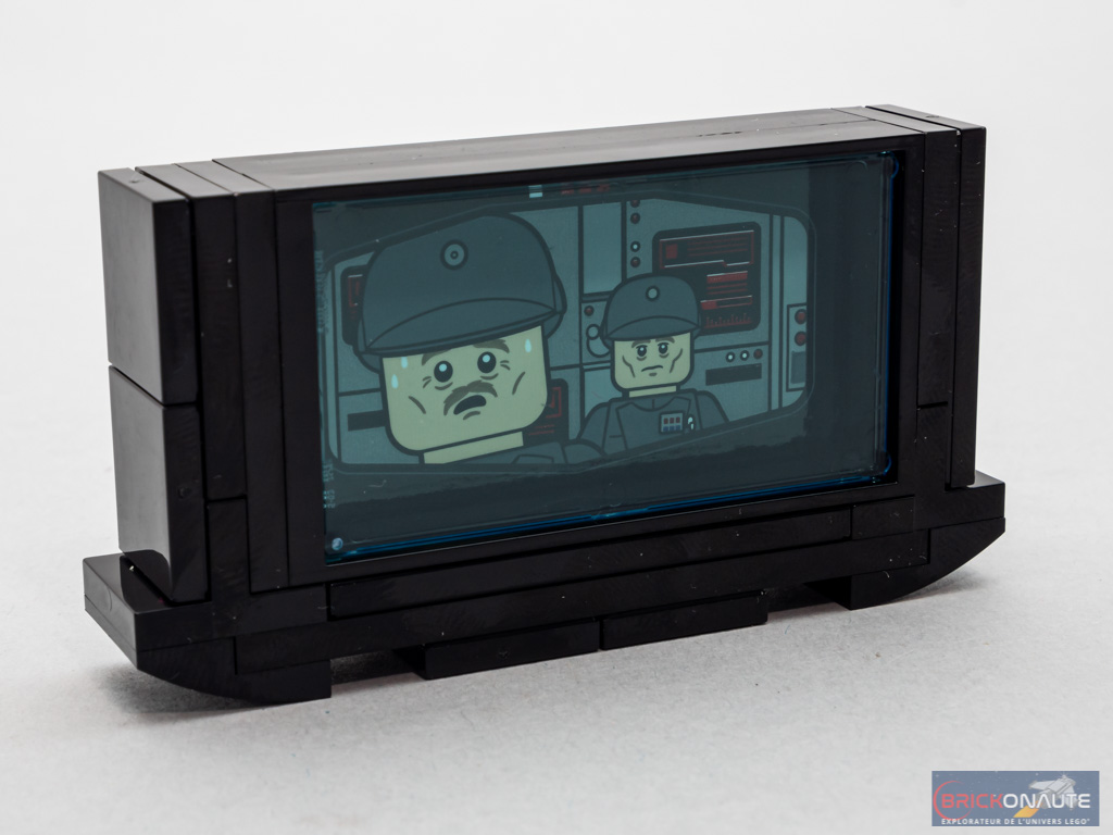 Nous attaquons alors le dernier sachet de pièces, portant le numéro 4. Qui commence avec la construction de l’écran principal. Un autocollant représente l’amiral Kendal Ozzel et le capitaine Firmus Piett. Ozzel, celui-là même qui se fait étrangler par Vador pour avoir quitté la vitesse lumière trop près de Hoth. Et Fimus Piett qui se retrouve pour l’occasion promu amiral. L’aspect bleuté est obtenu en plaçant une pièce trans blue devant l’autocollant – et c’est plutôt réussi.