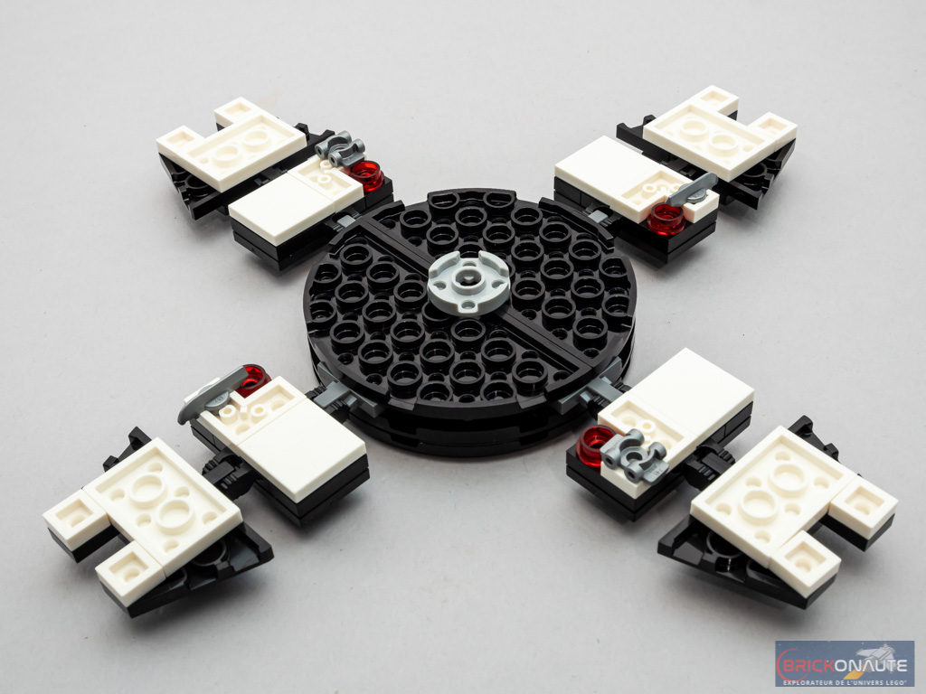 Nous construisons ensuite la partie mobile de la potence, qui n’est pas fixée sur la partie fixe : c’est une boule qui vient la bloquer en position, par gravité, dans le beam Technic. Ne reste ensuite qu’à construire la partie supérieure de la chambre, où on retrouve 4 autres « dents » articulées sur des charnières. Quelques tiles rouges translucides décorent la partie supérieure. On termine avec la pièce tampographiée indiquant le nom du set, fixée sur deux charnières.