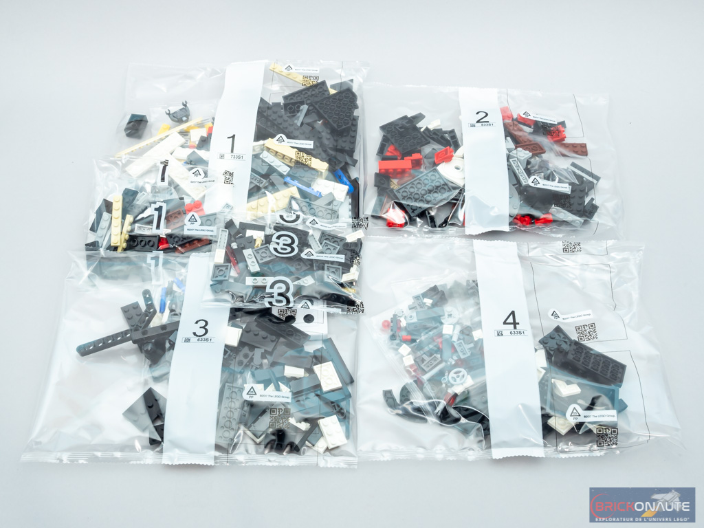 À l’intérieur, Nous trouvons 6 sachets de pièces numérotés de 1 à 4, une notice d’instructions de 116 pages pour 137 étapes de construction, et une planche de 4 autocollants.