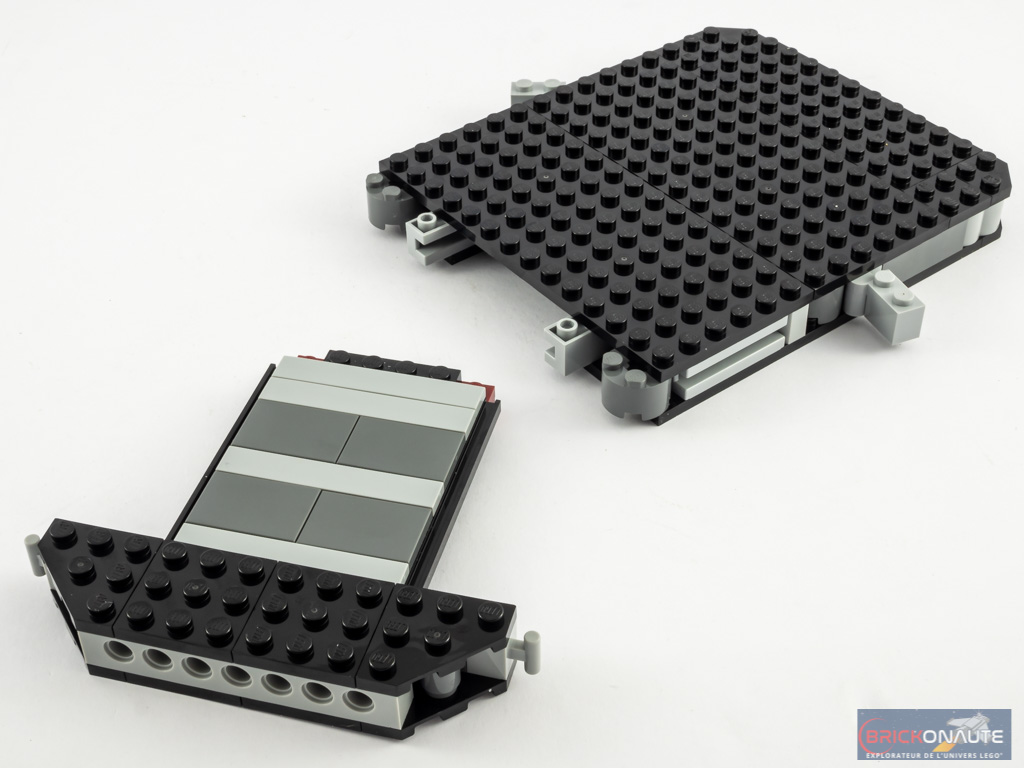 Avec le 1er sachet de pièces, nous commençons la construction par la partie centrale du modèle. De chaque côté, une charnière recevra par la suite sa portion de décor. Des rails sont disposés à l’intérieur de cette base. On y glisse le cheminement menant à l’escalier, qu’on bloque au-dessous par une plate afin qu’il ne soit pas possible de le sortir complètement de son logement. Tous ces petits mécanismes permettront au set de se « replier » et d’occuper ainsi une surface nettement plus compacte.