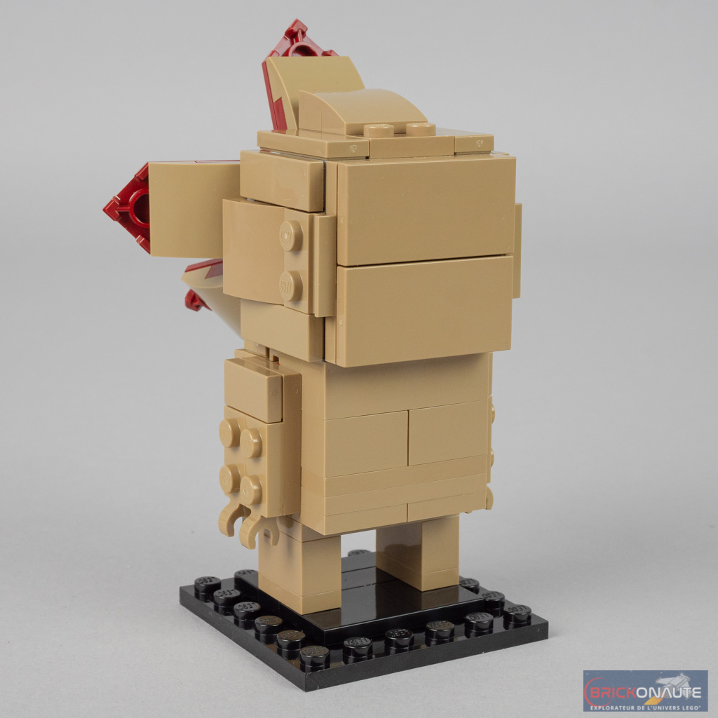 La construction du démogorgon est logiquement plus intéressante. À commencer par la structure du torse, qui permet de placer deux « grilles » sur l’avant. La structure de la tête est également très différente – on n’y trouve d’ailleurs pas l’habituel « cerveau » rose. Ici, la structure ne fait que deux tenons de profondeur et on vient y fixer une couronne sur un petit axe Technic. Sur cette couronne viennent se clipser les 5 « pétales », réalisés à l’aide de boucliers tampographiés.