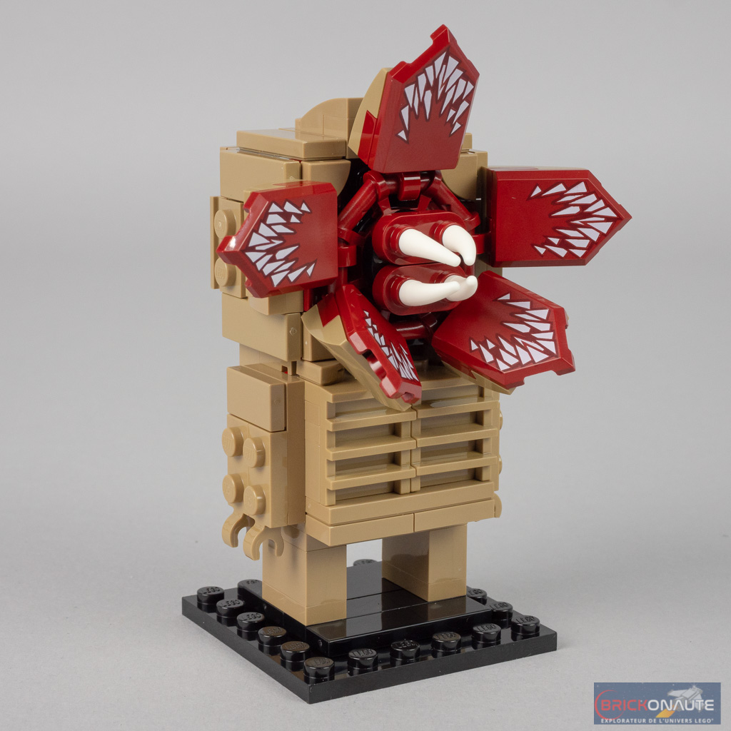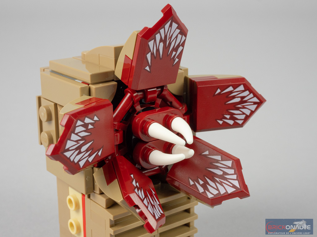 La construction du démogorgon est logiquement plus intéressante. À commencer par la structure du torse, qui permet de placer deux « grilles » sur l’avant. La structure de la tête est également très différente – on n’y trouve d’ailleurs pas l’habituel « cerveau » rose. Ici, la structure ne fait que deux tenons de profondeur et on vient y fixer une couronne sur un petit axe Technic. Sur cette couronne viennent se clipser les 5 « pétales », réalisés à l’aide de boucliers tampographiés.