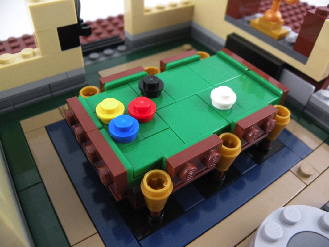 On construit ensuite le billard qui trône au milieu de la salle, les poches de ce dernier étant reconstituées à l’aide de cônes inversés. On notera que les billes sont en fait bel et bien fixées sur des tenons sous-jacents. Puis on s’attaque à l’élévation des murs, tout en aménageant un passage secret sous le trophée, grâce à un morceau coulissant le long du mur. On ajoute divers détails : un tableau (identique aux tiles que l’on retrouve sur le trottoir du Palace Cinema), une cible de fléchettes et un support pour les queues de billard. Un ventilateur prend place au dessus de la table.