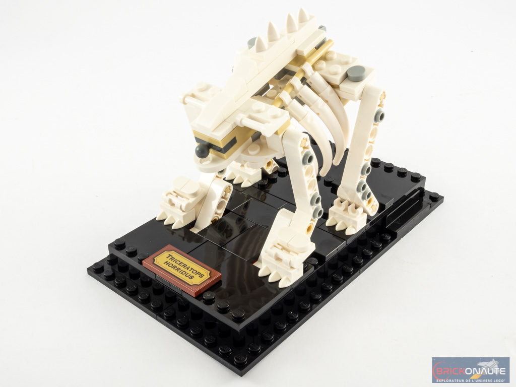 Comme j’aime Ă le faire avec les projets de la gamme LEGO Ideas, penchons-nous tout d’abord sur la fidĂ©litĂ© du set au projet original. Et le moins que l’on puisse dire, c’est qu’il a Ă©tĂ© trĂšs fortement adaptĂ©. Parmi la collection initiale de cinq animaux, nous n’en retrouvons ici « que » trois. Et parmi ces 3 dinosaures, un seul Ă©tait dans le projet original : le tricĂ©ratops. Autre diffĂ©rence majeure : le « look » du projet original se rapproche nettement plus de ce qu’on trouvera dans un musĂ©e : des os fins, couleur tan, et des supports complĂ©mentaires permettant de retenir une structure fragile. A l’exception du ptĂ©ranodon, les supports ont totalement disparu et les os des dinosaures ont grossi en consĂ©quence, pour pouvoir supporter leur propre poids.