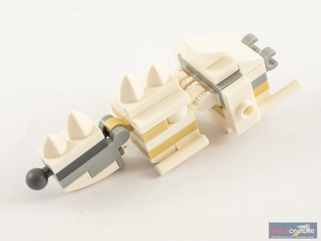 L’Ă©tape suivante commence avec la dĂ©coration des beams formant les pattes, avec quelques tiles. Le rendu final est ici assez peu organique et plutĂŽt Ă©pais, c’est un peu dommage. On construit ensuite les hanches et le coccyx de l’animal. La queue est constituĂ©e de 4 Ă©lĂ©ments mobiles et pourra donc ĂȘtre orientĂ©e, on la fixe sur une charniĂšre au corps. On s’attaque alors Ă la derniĂšre Ă©tape, peut-ĂȘtre la plus importante : la tĂȘte. Sa construction est trĂšs intĂ©ressante, et fait appel Ă quelques techniques bien senties pour un rĂ©sultat convaincant. Malheureusement, la bouche n’est ici pas mobile. On fixe la tĂȘte au corps sur un ball joint.