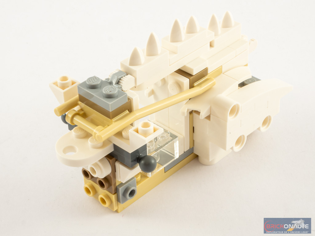 Dernier point sur lequel on pourra s’interroger : le choix des couleurs. Le blanc immaculé semble peu adapté à la représentation de fossiles vieux de plusieurs dizaines de millions d’années. En ce sens, le choix du tan dans le projet initial paraissait plus adapté. En revanche, je ne trouve pas que les pièces grises soient particulièrement gênantes : dans les musées, les morceaux d’animaux sont souvent reliés par des pièces métalliques. Il aurait par contre été intéressant de n’avoir qu’une seule nuance de gris.