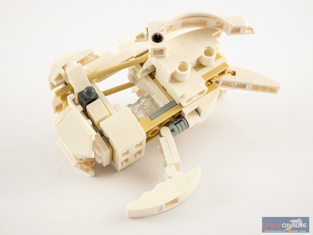 Et c’est à mon avis le principal défaut de ce parti-pris : d’une structure légère, on se retrouve avec quelque chose de beaucoup plus massif et moins cohérent visuellement. Les éléments fins, comme la queue ou la cage thoracique, coexistent avec des pattes beaucoup plus imposantes.