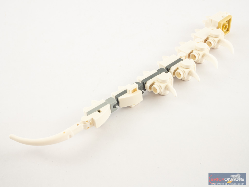 Nous continuons notre construction avec la queue du dinosaure. Tous les éléments sont articulés entre eux, soit par des charnières, soit par des ball joints. On choisira donc comment exposer le dinosaure. On construit le cou sur le même principe que la queue, puis on s’attaque à la tête. Celle-ci est assemblée en deux morceaux : la partie supérieure ; et la mâchoire inférieure. Des clips rassemblent les deux morceaux et offrent donc un peu de mobilité à la mâchoire. On fixe la tête sur un ball-joint (elle est d’ailleurs assez lourde, et penche sous son propre poids) ce qui achève la construction de notre set.