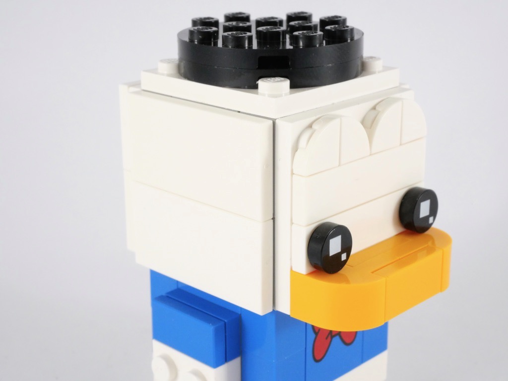 Bon, je ne vais pas faire durer le suspense plus longtemps. Comme je vous le disais en introduction, les premiers visuels de ce set n’étaient pas très engageants. Et à juste titre. Le défaut le plus flagrant est très certainement le bec, épais et plat, sans l’ombre d’une tampographie. Les yeux standards de la gamme LEGO Brickheadz ne sont pas adaptés : de grands yeux sur fond bleu auraient sans doute mieux convenu. Enfin, pour un personnage plutôt « fin », l’aspect massif intrinsèque aux BrickHeadz n’est pas non plus très adapté.