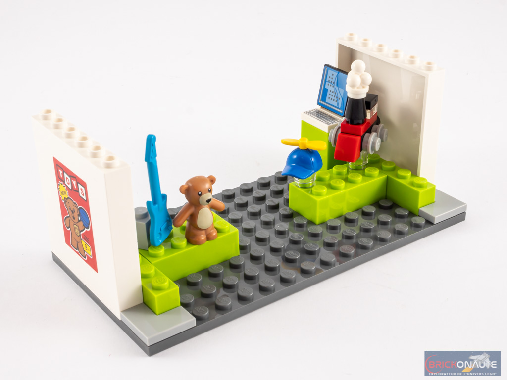 Sur une grande plate grise, on commence par ajouter des étals verts qui reçoivent quelques jouets : un petit train, une casquette à hélice (référence au 2ème épisode de la série LEGO City Adventures), un nounours ou encore une guitare. On ajoute ensuite les murs, la grande vitrine et la porte d’entrée. L’un des deux murs blanc porte un grand autocollant qu’on essaiera de centrer tant bien que mal. Les vitrines sont entourées de briques vertes et surmontées d’un toit gris. On ajoute sur ce toit deux ballons et l’enseigne du magasin. Deux grands autocollants sont collés sur celle-ci et ne sont pas spécialement faciles à aligner. Ils sont d’ailleurs très légèrement décalés sur la photo ci-dessous. Un petit panneau publicitaire, et un pot vert contenant un filet à papillons sont disposés au pied du bâtiment.