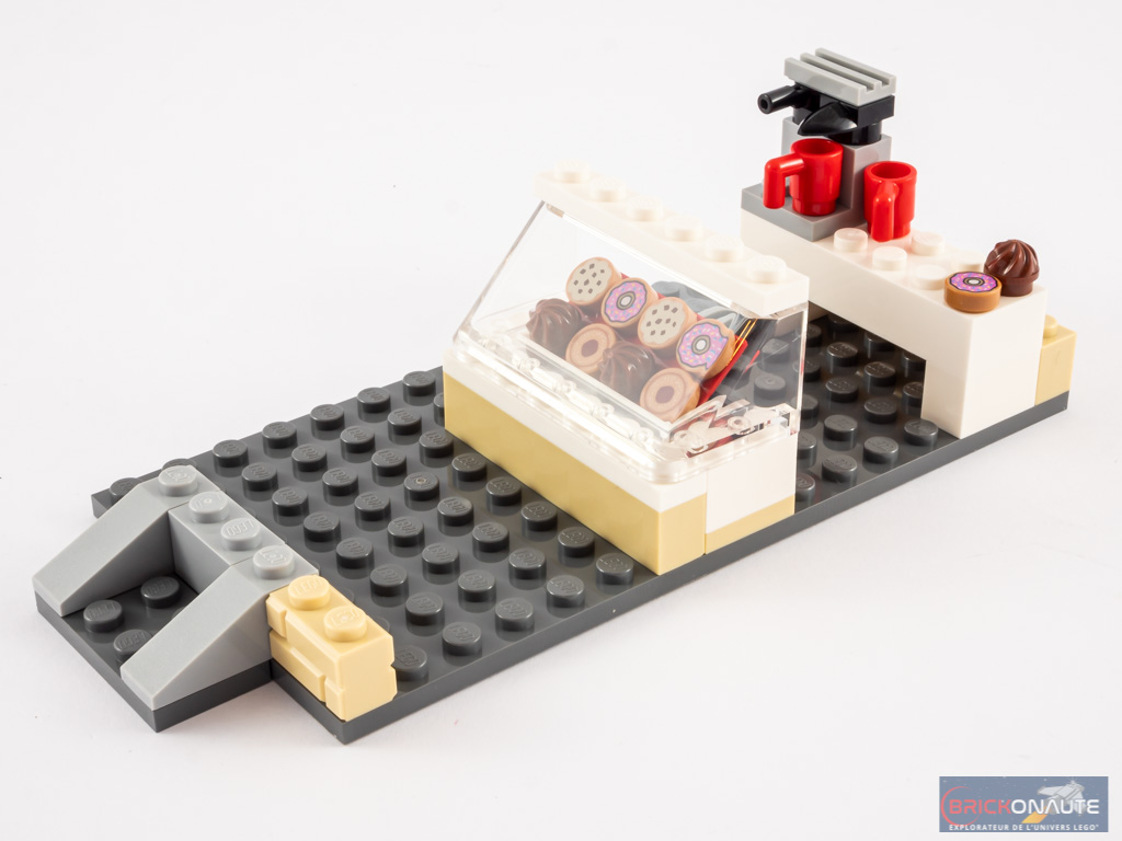 Sur une grande plate grise, on commence par ajouter quelques murs et une vitrine (réalisée avec un pare-brise) de gâteaux. Les gâteaux sont disposés sur des charnières : on peut donc les disposer parallèlement à la vitrine. C’est malin, et plutôt joli. De l’autre côté, nous construisons une machine à café.