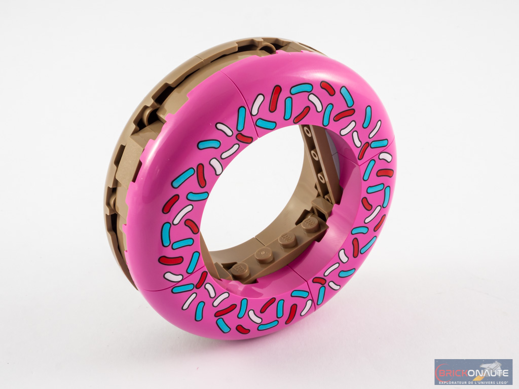 La construction de l’enseigne du magasin de donuts est assez rapide. On vient habiller une structure composée de briques SNOT avec de grandes arches de part et d’autre. Les pièces roses sont ici, fort heureusement, tampographiées. On fixe le donut géant au magasin, et notre modèle est terminé.