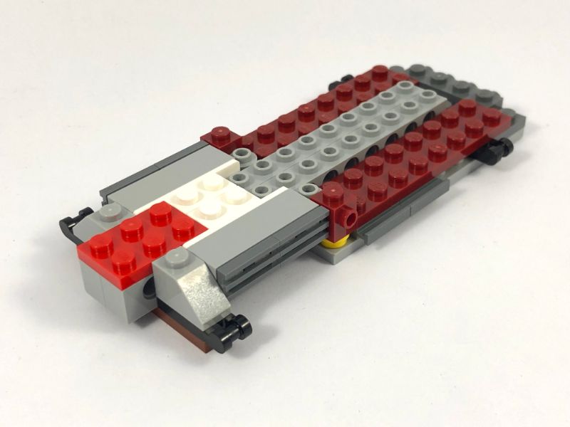 Le sachet de pièces portant le numéro 2 nous permet d’assembler le camion que les personnages doivent escorter dans le jeu. Le châssis est assez simple, composé d’une grande plate grise à l’avant et de deux barres technic permettant de fixer l’essieu arrière. On notera tout de même une petite différence avec un véhicule « classique » : dans le jeu, le véhicule lévite au dessus du sol. Ici, des dishs sont clipsées au châssis, et de petites roues (presque invisibles, c’est le but) habituellement trouvées sur les trains permettent tout de même de déplacer le camion.