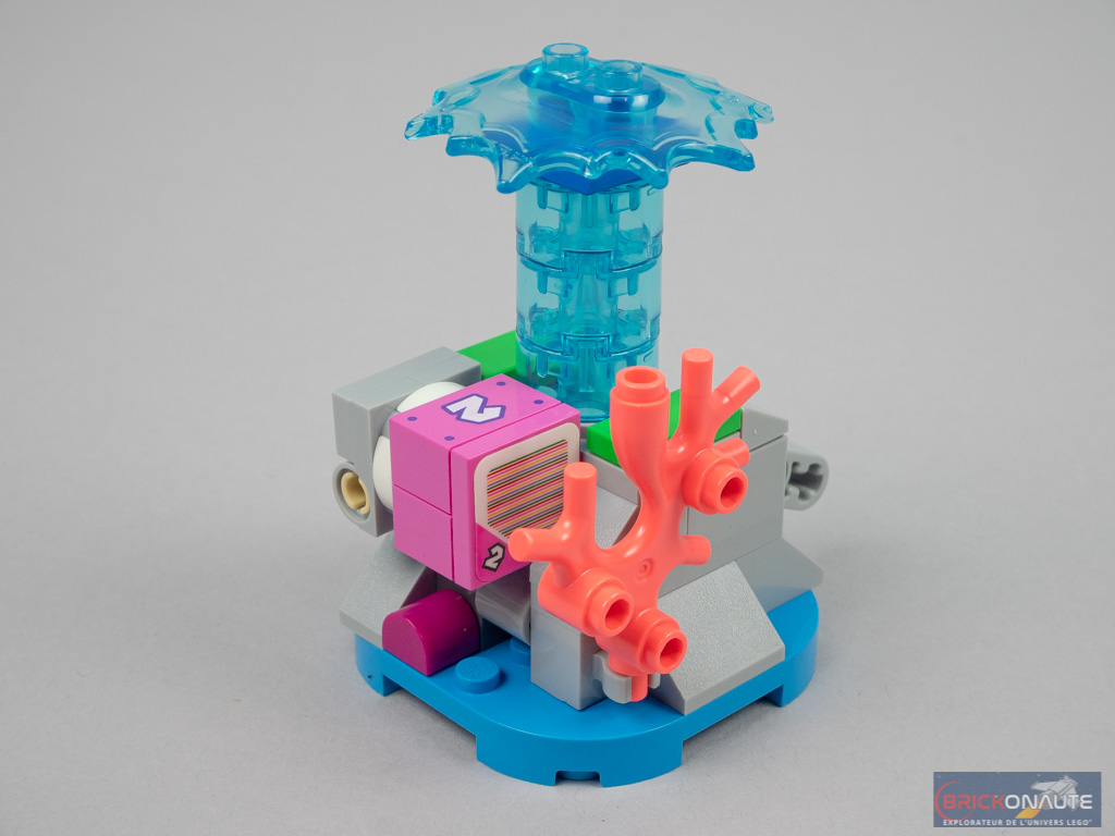 Nous continuons avec un rocher, renfermant un levier Technic articulé sur un pin. Cette fois, c’est en tapant sur ce levier qu’on libère le bloc portant le numéro 2. Remarquez également le joli jet d’eau, qui rappelle ceux vus dans le set 71400 Big Urchin Beach Ride.