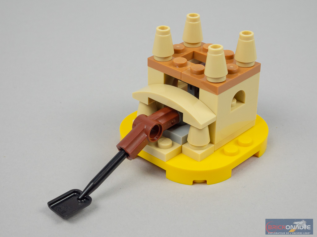 La deuxième construction est un château de sable, qui abrite le bloc portant le numéro 1. En poussant sur la pelle, de chaque côté, on fait tomber les deux moitiés du château et on libère l’accès à ce premier bloc.