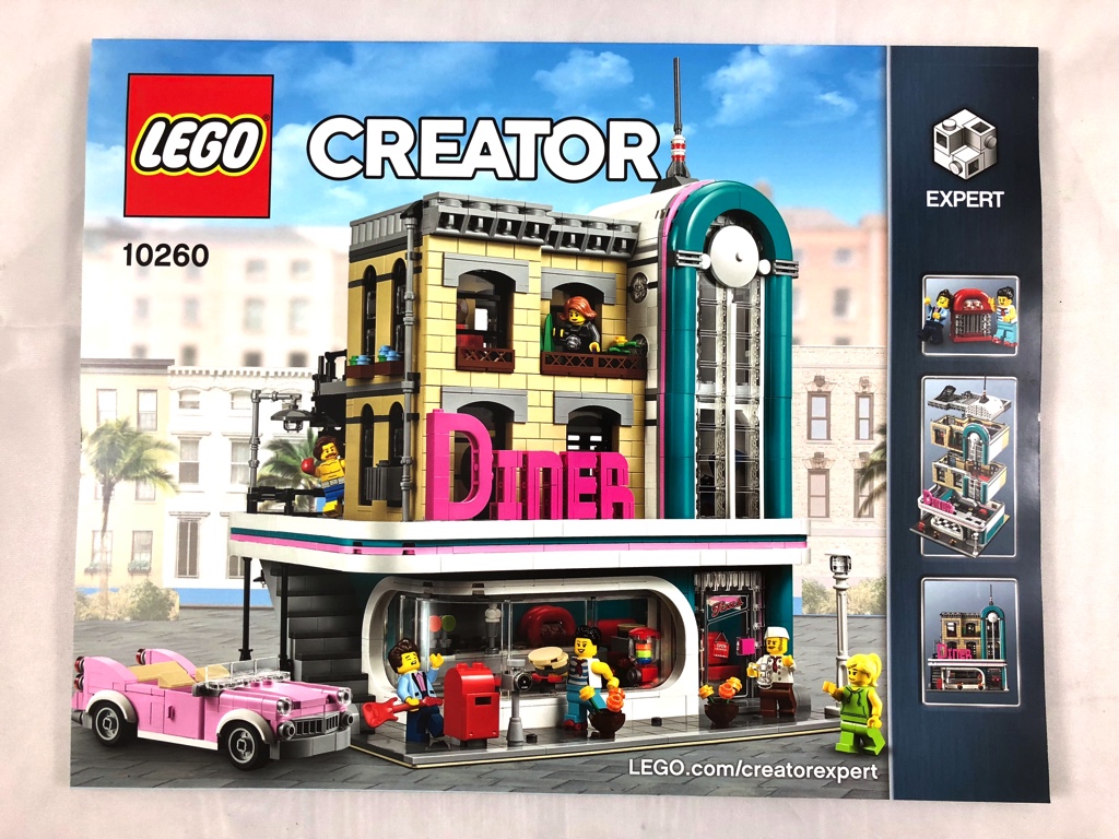 On trouve sur l’avant de la boîte notre Diner vu légèrement de côté, avec les différents personnages en train de vaquer à leurs occupations. Sur le côté droit, on retrouve une version éclatée du bâtiment, une autre vue avec les dimensions de celui-ci, et une troisième avec deux personnages à côté du jukebox. Petite coquille sur ma boîte : la mention « Expert » est manquante sous le logo habituel. Sur l’arrière, on retrouve notre set à côté du 10255 – Assembly Square (La place de l’Assemblée) et du 10251 – Brick Bank (La banque de briques). Malgré la différence architecturale entre les bâtiments, l’intégration fonctionne plutôt bien. On retrouve également, comme d’habitude, une vue des trois étages séparés, ainsi qu’une collection de vignettes nous montrant un certain nombre de détails.