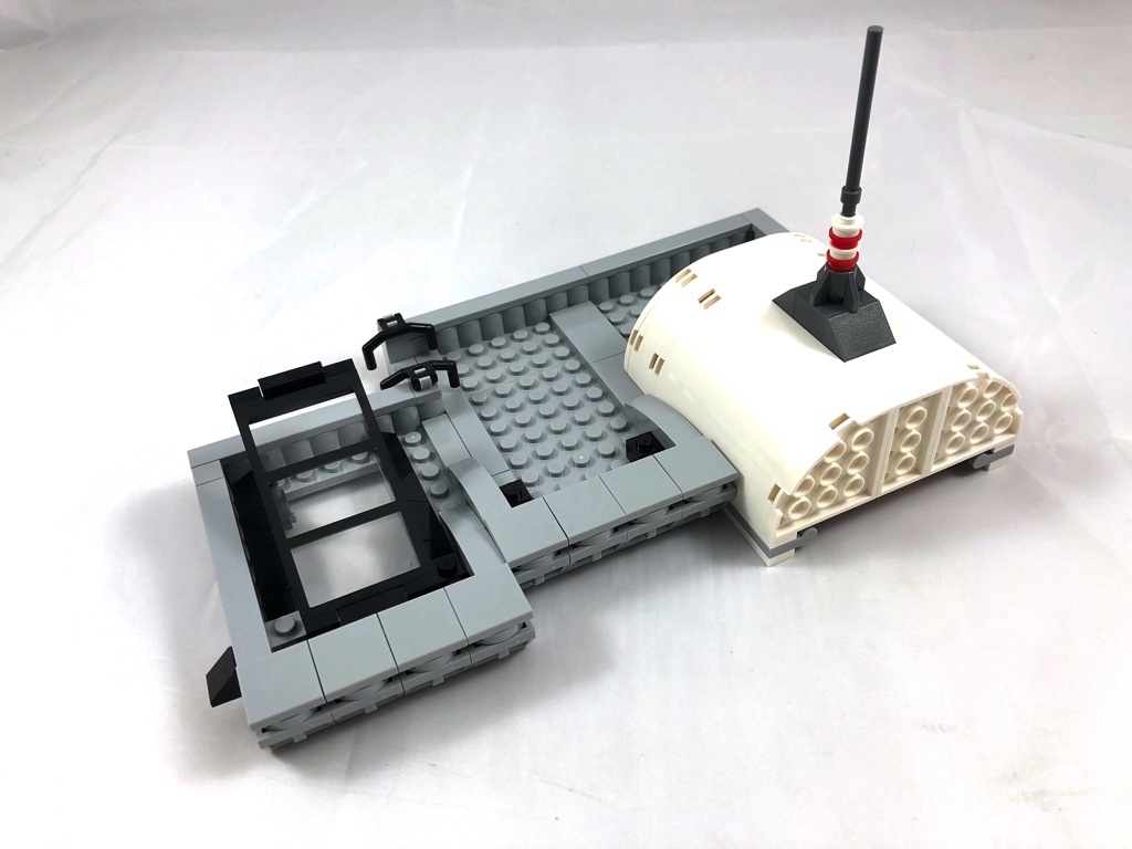 Là encore, on commence en assemblant la base couleur light bluish gray, avant de construire les murs et d’aménager l’intérieur. On y trouve donc un fauteuil et son guéridon, un buffet avec deux verres et une bouteille, et une console pour le studio. Le mur « antibruit » de celui-ci est réalisé grâce à des crémaillères Technic. De petits hublots transparents sont réalisés grâce à des arches placées en vis-à-vis. Un micro « vintage » est ajouté dans le studio, ainsi que des vitres donnant sur la régie. Enfin, on ajoute dans celle-ci le matériel d’enregistrement à proprement parler. On termine ensuite l’élévation des murs, et on y accroche quelques décorations, comme une pochette d’album et un disque d’or. Les fenêtres et les murs sont réalisés de la même manière que l’étage inférieur. On termine cet étage en construisant la partie vitrée, surplombée d’une arche qui dépasse nettement au dessus, qui sera habillée avec le toit. Différence notable avec l’étage inférieur : le petit balcon, sur lequel on vient ajouter quelques plantes et une balustrade.