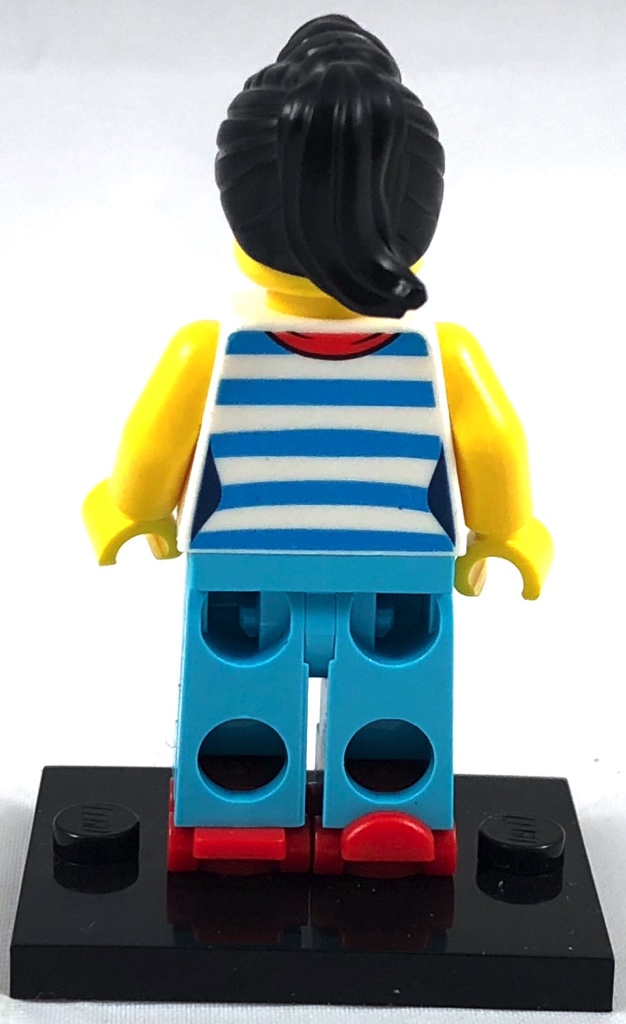 La serveuse aussi porte un foulard rouge autour du cou, ça doit faire partie de l’uniforme 😉 Le haut est en fait un débardeur-marinière bleu ciel et blanc, également tampographié des deux côtés. Elle est propulsée par une paire de patins à roulettes rouges, et présente un joli sourire à ses clients sous sa coiffure noire avec une queue de cheval (vue une seule fois dans un autre set).