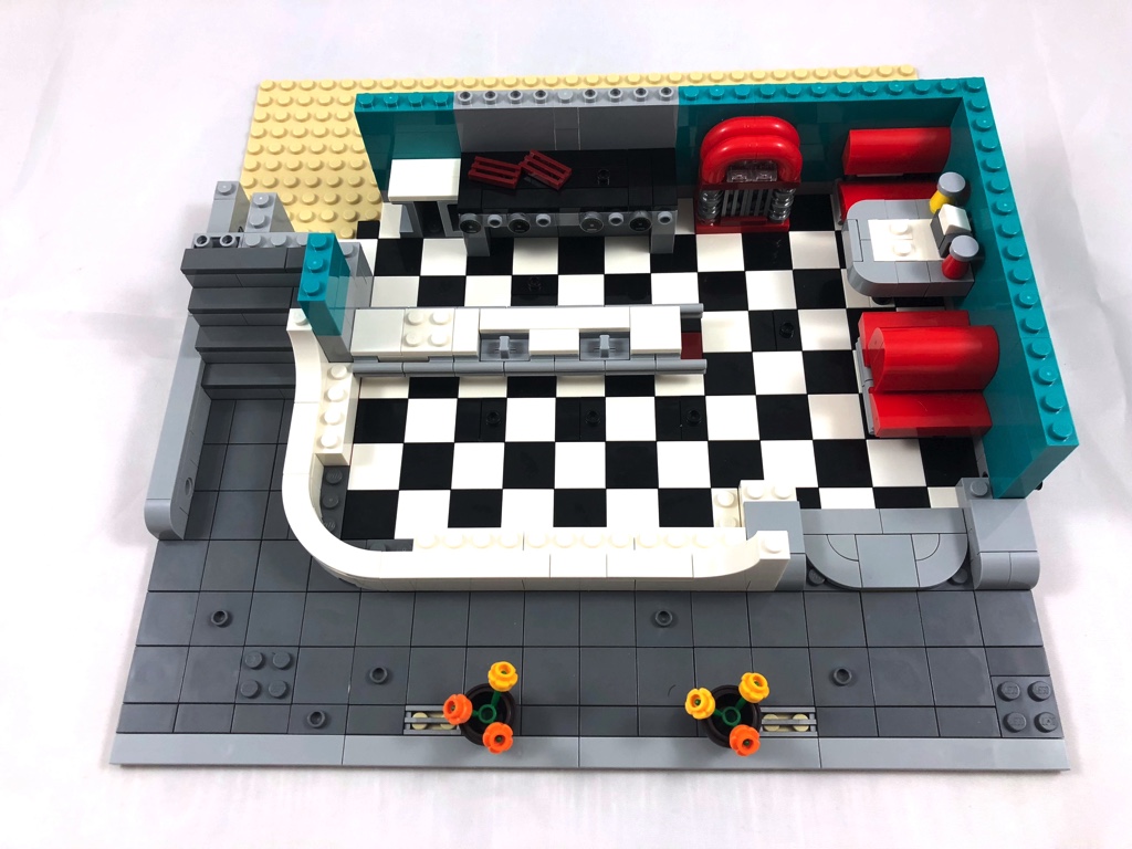 Les deux premières séries de sachets de pièces vont nous permettre de construire le restaurant situé au rez-de-chaussée. Rien d’autre n’est construit à cet étage, ça vous donne une idée de la taille de ce dernier. On commence comme d’habitude par la réalisation du « pavage » du sol, sur la plaque de base couleur tan. Le noir et le blanc sont omniprésents, et nous emmènent tout de suite dans les années 50. Puis on alterne les phases de construction des murs, et d’ajout de mobiliers divers et variés. On commence ainsi par le très grand comptoir, les fauteuils rouge rembourrés comme il faut, et le grill pour que le chef puisse travailler. On ajoute ensuite beaucoup de détails (les sauces sur la table avec un distributeur de serviettes, ou les steaks sur le grill). Un très beau jukebox est également de la partie, ainsi qu’une cafetière (filtre, nous sommes dans un Diner) et un distributeur de bonbons. Trois tabourets rouges prennent place devant le comptoir. On notera également la grande hotte au dessus des tables de cuisson, ingénieusement réalisée.
