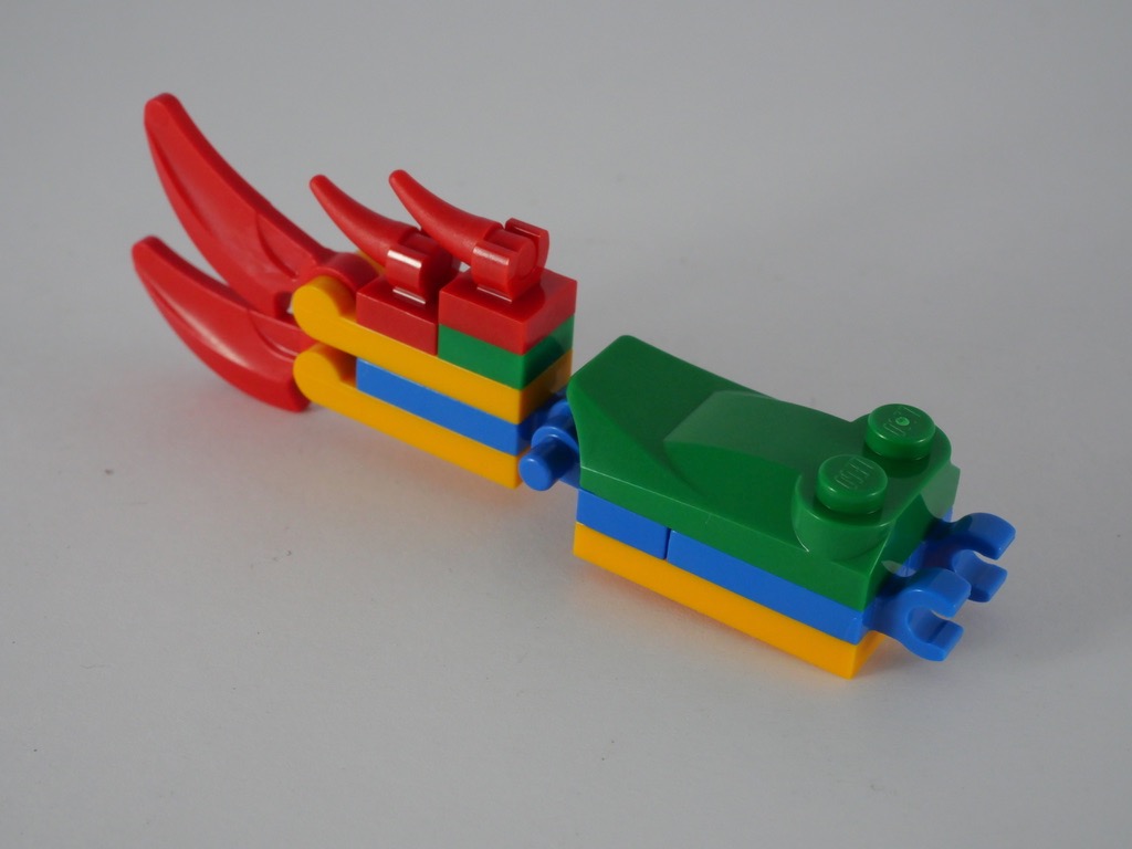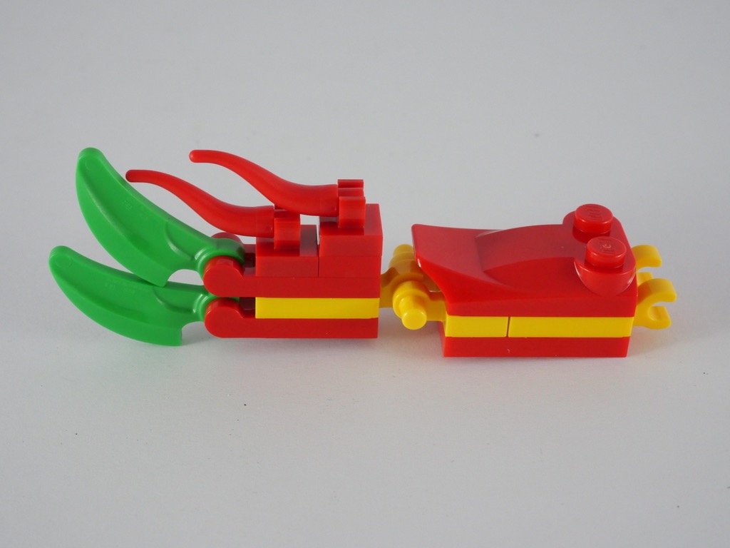 Avec le second, on commence par la queue du dragon ; ce sont 2 petits sous-assemblages clipsés à l’arrière du bateau. On passe alors à l’élément le plus intéressant : la tête. L’assemblage est très ingénieux et complètement brick built : pas d’autocollant à l’horizon. On y retrouve des pièces aussi variées qu’un capot de voiture, des palmes, et évidemment des crocs. La tête est fixée au bateau par un charnière à cliquet : elle ne s’effondre donc pas sous son propre poids.