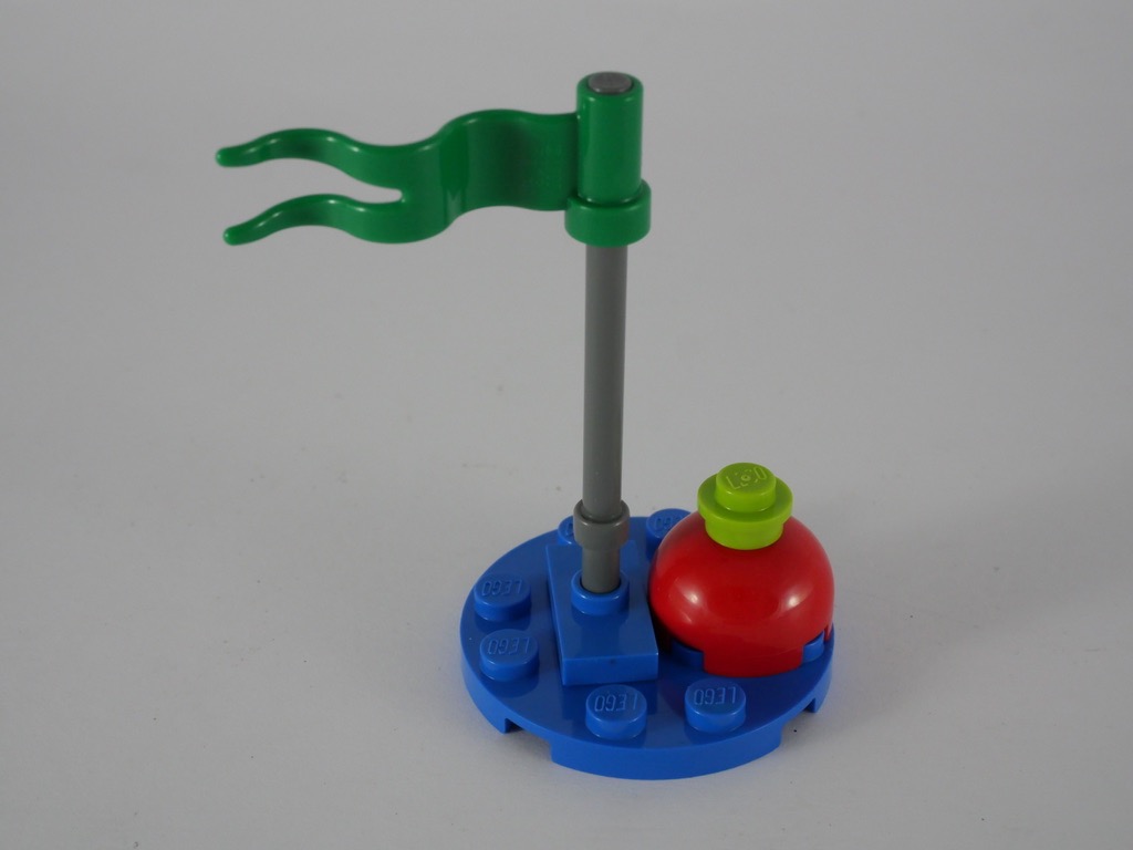 Le dernier sachet de pièces ne concerne que la partie la plus haute du quai. Sur une plate bleue, on assemble un petit morceau de lac. Quelques nénuphars, des tiles translucides et même nue grenouille apportent leur lot de détail à l’ensemble. Un poteau central et deux croisillons supportent la partie supérieure, qui ressemble au stand de zonzi préalablement construit. La partie supérieure est cependant plus travaillée et colorée, des saucisses étant utilisées pour apporter une forme ondulée. Un guéridon, sur le côté droit, supporte la coupe réservée aux champions.