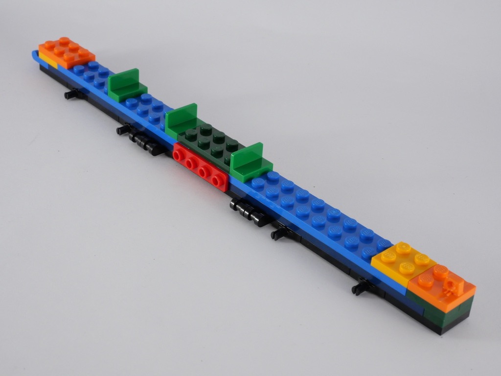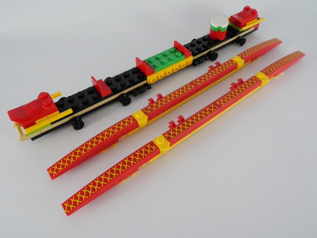 Après avoir construit la première bouée, nous attaquons le bateau rouge. Le fond est plat, d’une longueur de 20 tenons pour 2 tenons de large. 4 essieux sont installés au-dessous pour recevoir les roulettes, puis 3 dossiers au-dessus pour installer les 3 rameurs. On construit alors le tambour, puis les deux côtés qui seront clipsés au « fond » du bateau. Ces deux côtés sont chacun décorés de 4 longs autocollants, avec des écailles de dragon. Ils ne sont d’ailleurs pas forcément faciles à appliquer. C’est ainsi que se termine le 1er sachet de pièces.