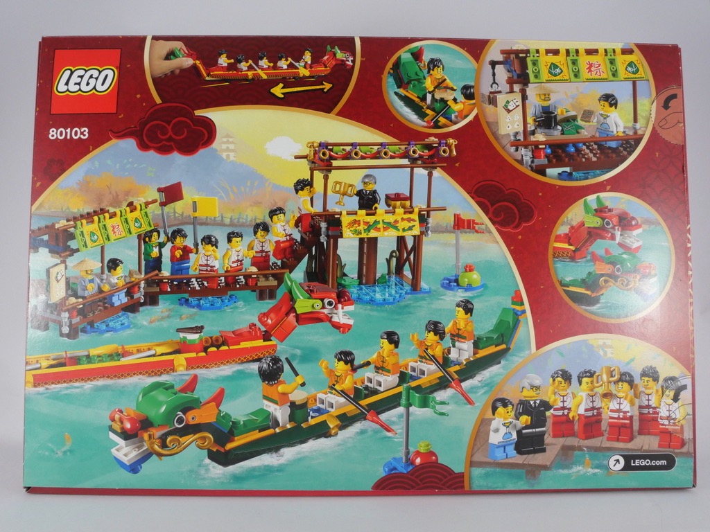 Le set est présenté dans une belle livrée rouge. Les deux bateaux se font la course sur l’avant de la boîte, tandis qu’un juge, deux spectateurs, un marchand et un jeune garçon observent la scène. Dans le coin supérieur droit, un macaron mentionne « The Dragon Boat Festival – Chinese Festival Special Edition ». Au dos, quelques vignettes zooment sur des détails, l’une d’entre elles nous montrant les roues sous les bateaux : plus pratique pour faire la course.