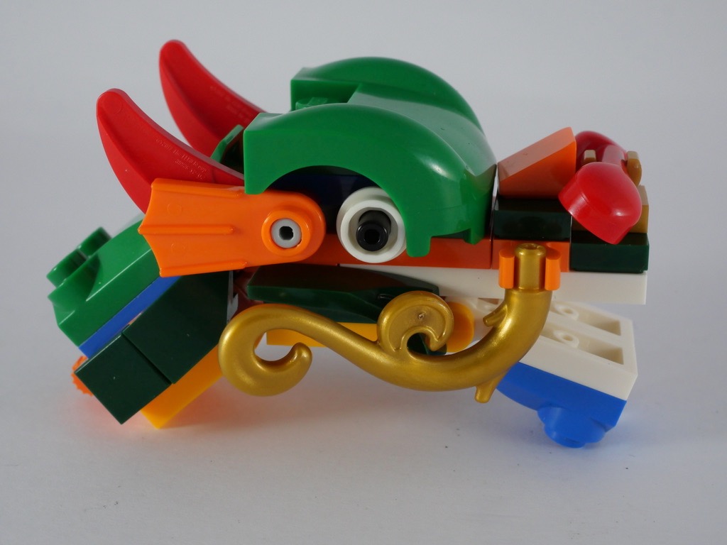 Avec le second, on commence par la queue du dragon ; ce sont 2 petits sous-assemblages clipsés à l’arrière du bateau. On passe alors à l’élément le plus intéressant : la tête. L’assemblage est très ingénieux et complètement brick built : pas d’autocollant à l’horizon. On y retrouve des pièces aussi variées qu’un capot de voiture, des palmes, et évidemment des crocs. La tête est fixée au bateau par un charnière à cliquet : elle ne s’effondre donc pas sous son propre poids.