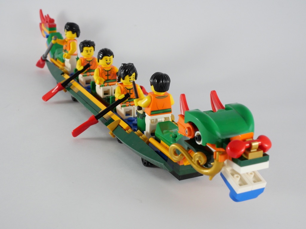 La jouabilité n’est pas en reste. Comme dit plus haut, nous disposons de 15 minifigs. Mais nous avons également 2 bateaux, munis de roues cachées pour pouvoir faire la course et de bouées pour matérialiser la ligne d’arrivée. Et le morceau de quai avec le stand, la coupe à offrir aux vainqueurs ou le stand de zongzi. Tout ce qu’il faut pour se raconter un petit paquet d’histoires, et faire la course avec deux bateaux de conception robuste.