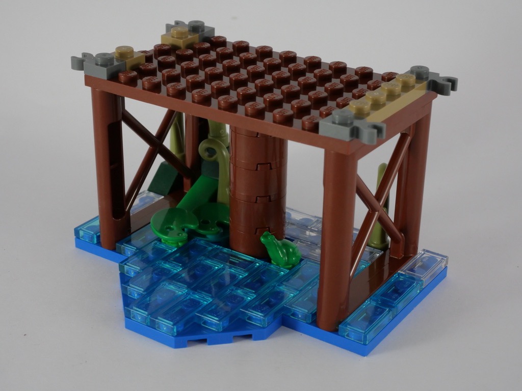 Le dernier sachet de pièces ne concerne que la partie la plus haute du quai. Sur une plate bleue, on assemble un petit morceau de lac. Quelques nénuphars, des tiles translucides et même nue grenouille apportent leur lot de détail à l’ensemble. Un poteau central et deux croisillons supportent la partie supérieure, qui ressemble au stand de zonzi préalablement construit. La partie supérieure est cependant plus travaillée et colorée, des saucisses étant utilisées pour apporter une forme ondulée. Un guéridon, sur le côté droit, supporte la coupe réservée aux champions.