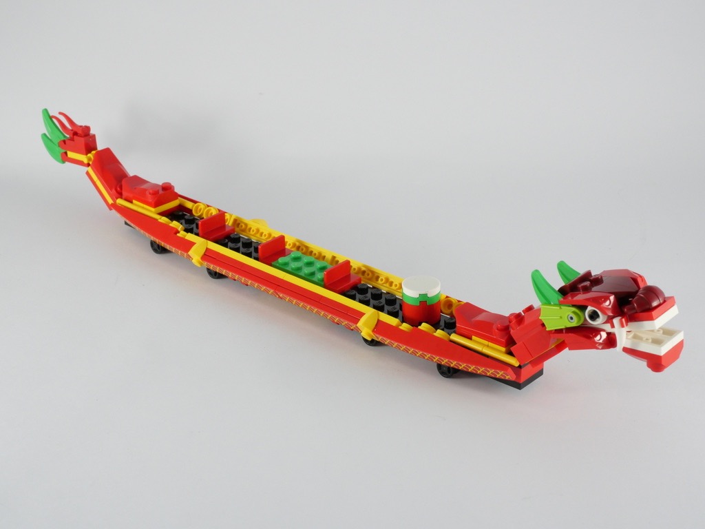 Si le design des bateaux est réussi, le design du morceau de quai qui les accompagne l’est tout autant. Là encore, on se retrouve plongé dans la Chine traditionnelle, avec ces grandes barres marron, inégales, faisant instantanément penser à une construction en bambou. On notera également tous les petits détails, depuis la grenouille cachée sous le quai jusqu’au stand de zongzi avec ses ustensiles de cuisine. Les nouvelles cheese slopes tampographiées sont d’ailleurs très jolies. Le zongzi est un plat traditionnel originaire du centre de la Chine continentale. Il s’agit de riz gluant, farci à la viande de porc, au jaune d’œuf de cane, arachide, champignons noirs ou navets. Ils sont enveloppés dans des feuilles de bambou, et cuits à la vapeur ou à l’eau. Nous avons des zongzi représentés crus (les cheese slopes vertes) ou cuits (avec une couleur dark tan). Ici encore, si LEGO avait pu nous gratifier de quelques pièces tampographiées ça n’aurait pas été un luxe. Le dragon, situé sous le podium, est constitué de 4 autocollants distincts : autant de problèmes d’alignement et d’espacement.