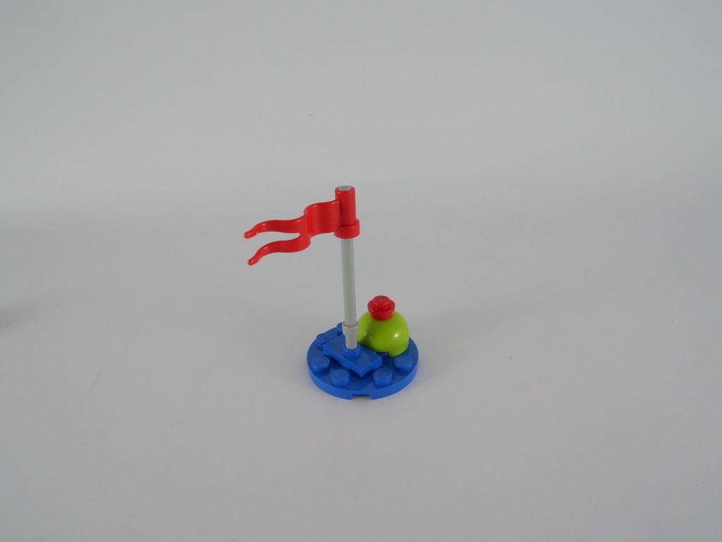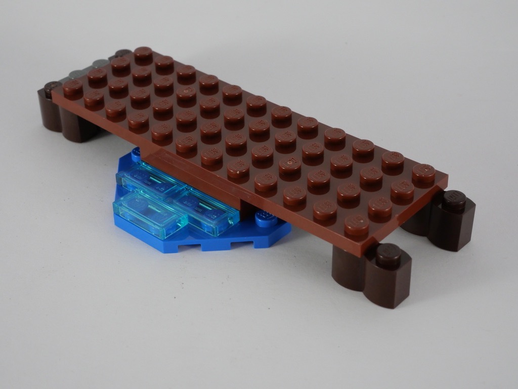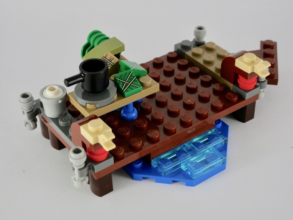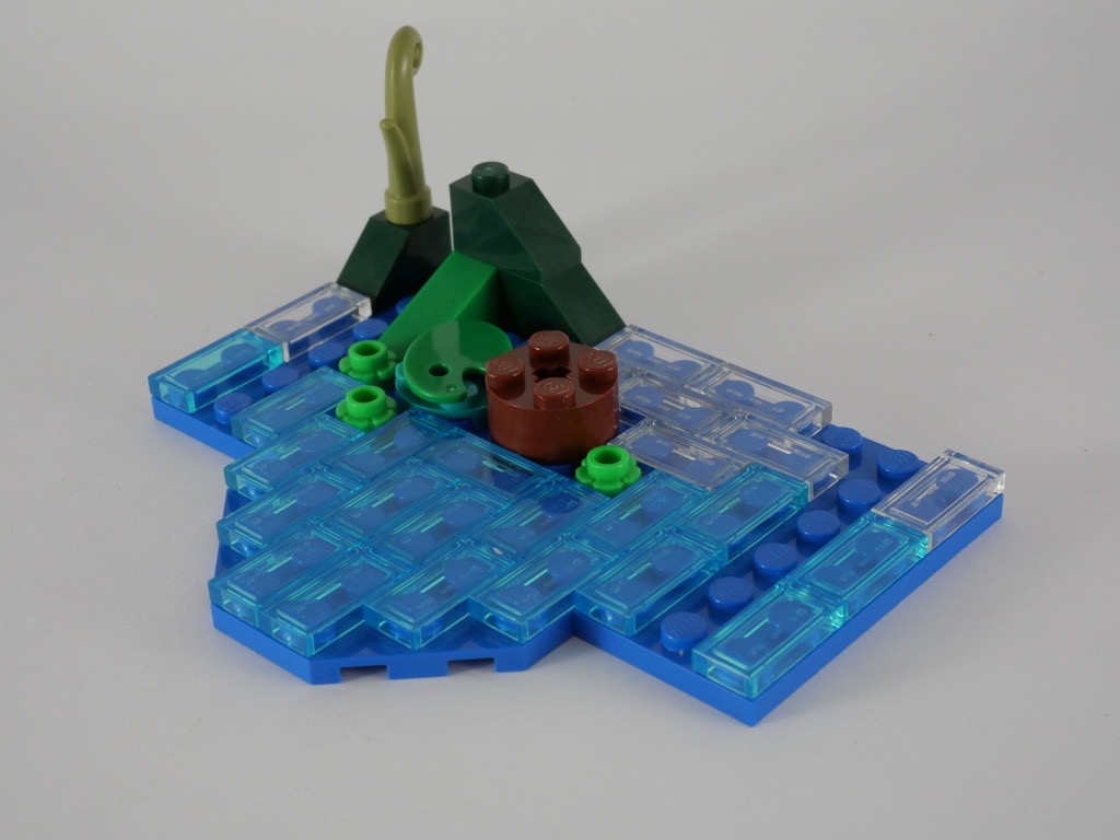 Le dernier sachet de pièces ne concerne que la partie la plus haute du quai. Sur une plate bleue, on assemble un petit morceau de lac. Quelques nénuphars, des tiles translucides et même nue grenouille apportent leur lot de détail à l’ensemble. Un poteau central et deux croisillons supportent la partie supérieure, qui ressemble au stand de zonzi préalablement construit. La partie supérieure est cependant plus travaillée et colorée, des saucisses étant utilisées pour apporter une forme ondulée. Un guéridon, sur le côté droit, supporte la coupe réservée aux champions.