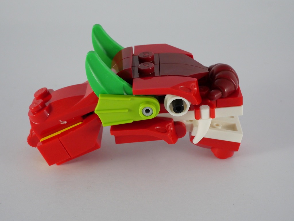 Avec le second, on commence par la queue du dragon ; ce sont 2 petits sous-assemblages clipsés à l’arrière du bateau. On passe alors à l’élément le plus intéressant : la tête. L’assemblage est très ingénieux et complètement brick built : pas d’autocollant à l’horizon. On y retrouve des pièces aussi variées qu’un capot de voiture, des palmes, et évidemment des crocs. La tête est fixée au bateau par un charnière à cliquet : elle ne s’effondre donc pas sous son propre poids.