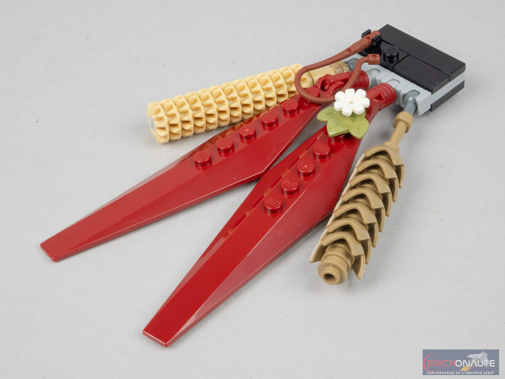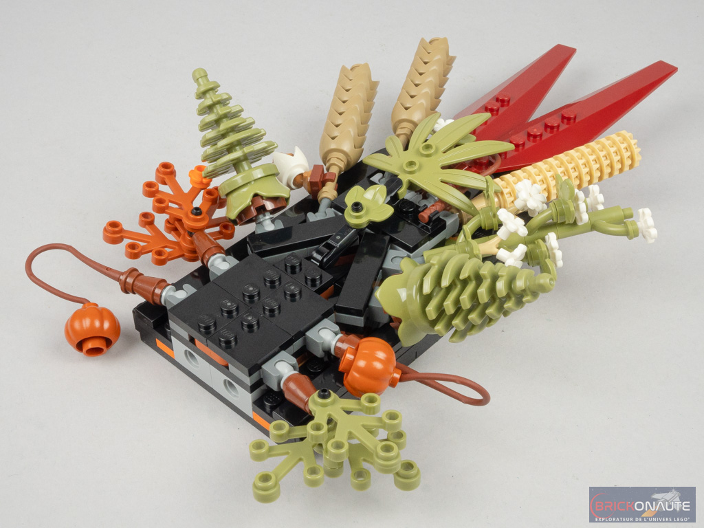 Du côté de l’inventaire, c’est plutôt généreux avec 812 pièces pour 49,99 €, même si le set contient beaucoup de petits éléments. Les pièces sont réparties en 116 éléments différents. On remarque évidemment de nouveaux éléments dans cet inventaire avec par exemple de grands pétales nougat, des citrouilles dark orange, des épaulettes (!) bright orange, des corolles tan, des bouts de rame et des grandes feuilles dark red – et même une nouvelle couleur pour le sapin classique en olive green. Et cette liste n’est pas exhaustive !