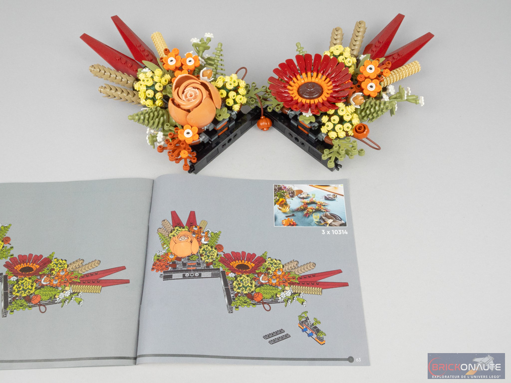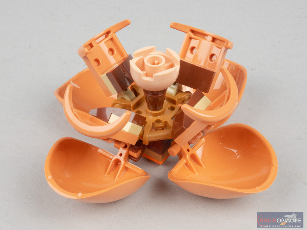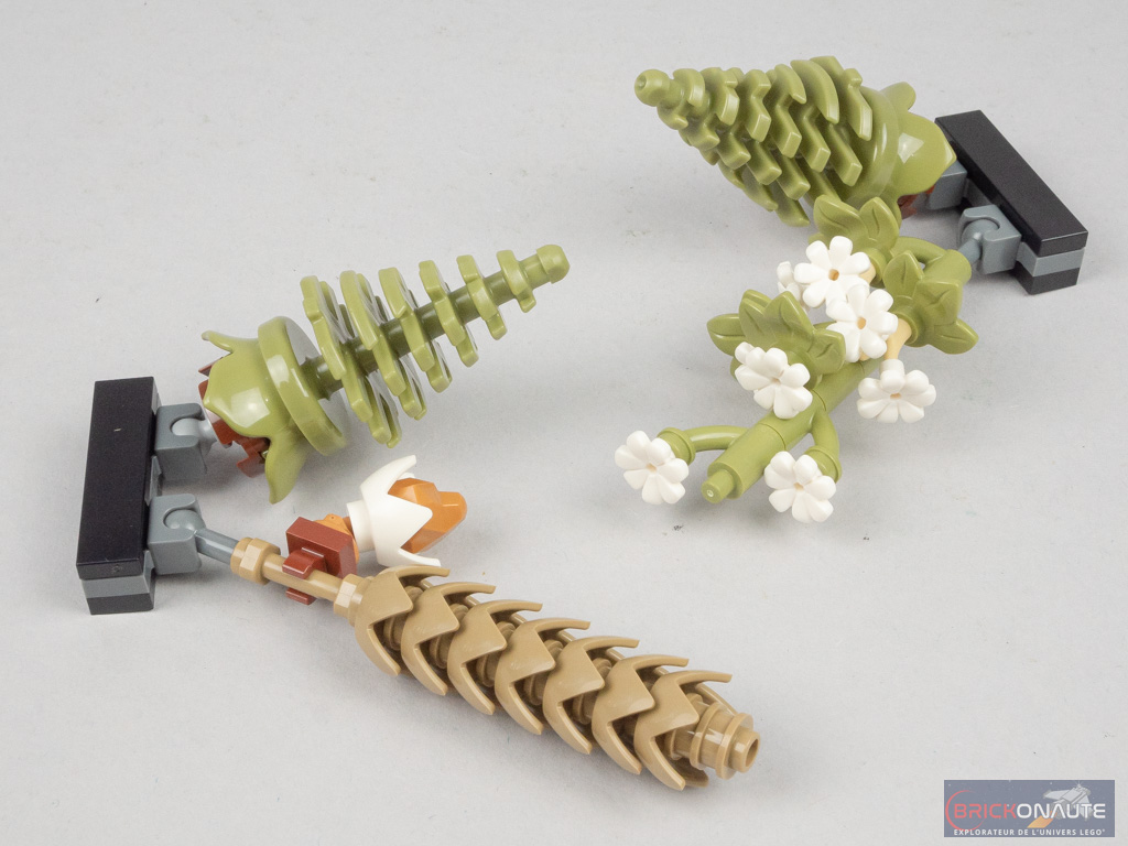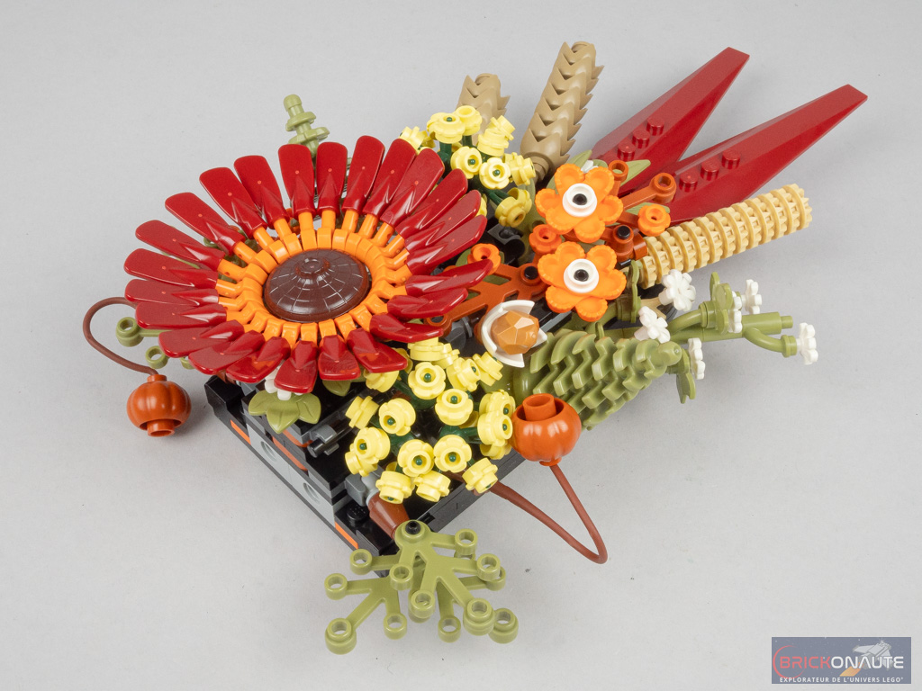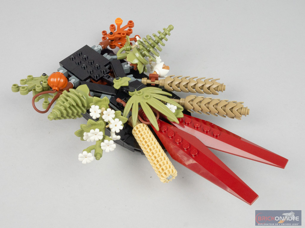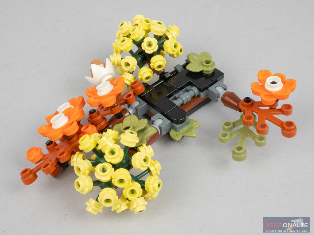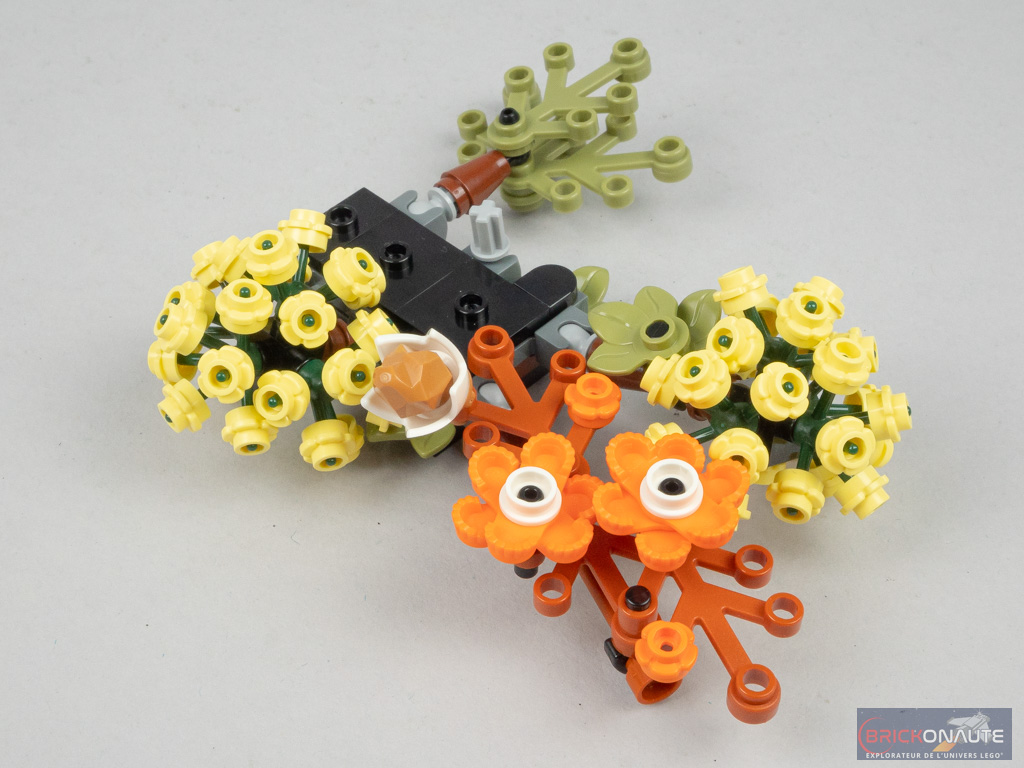 Vous avez pu le constater à la lecture du chapitre précédent : le processus d’assemblage n’est pas spécialement passionnant et souvent répétitif. Mais c’est difficile d’en vouloir au designer sur ce point, c’est l’exercice qui veut ça. On appréciera cependant la manière de détourner des éléments de leur utilisation habituelle, avec, pêle-mêle, des engrenages Technic qui, superposés, se transforment en millet perlé, des citrouilles en alkékenge, ou des épaulettes de soldats oranges en cosmos.