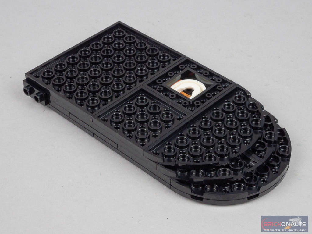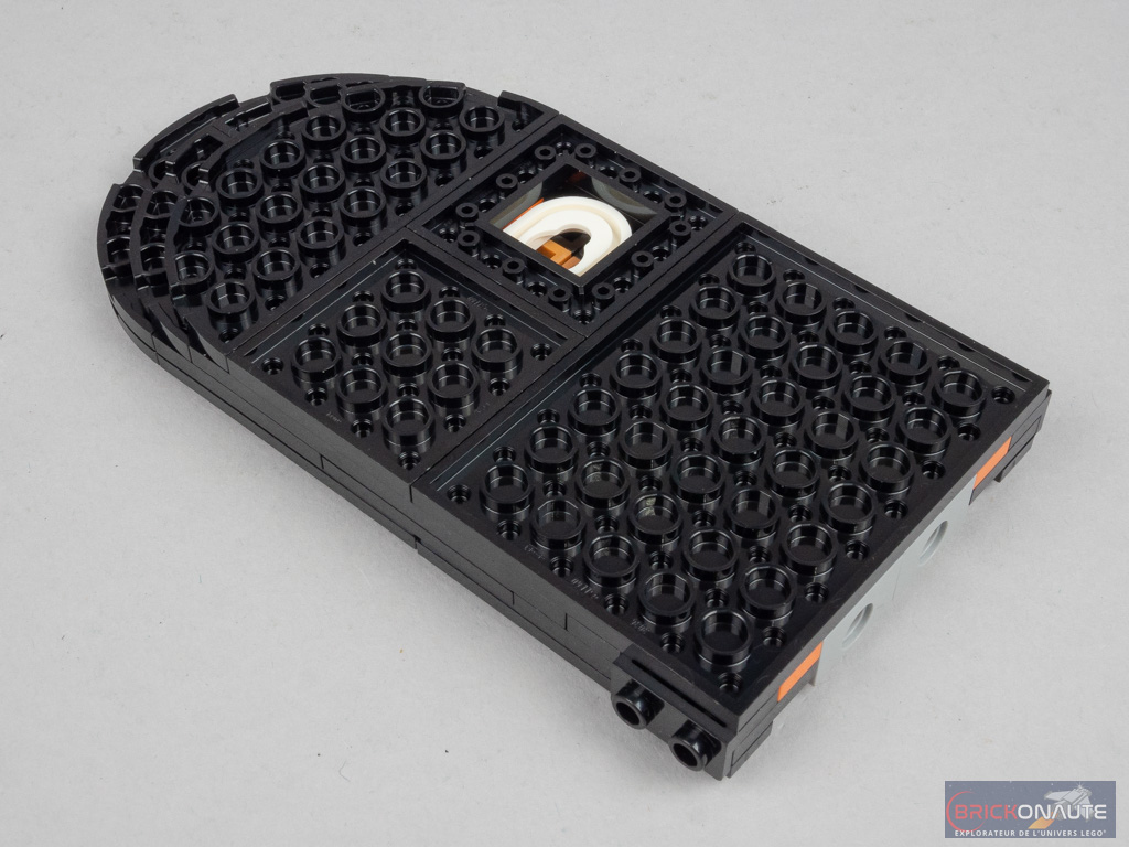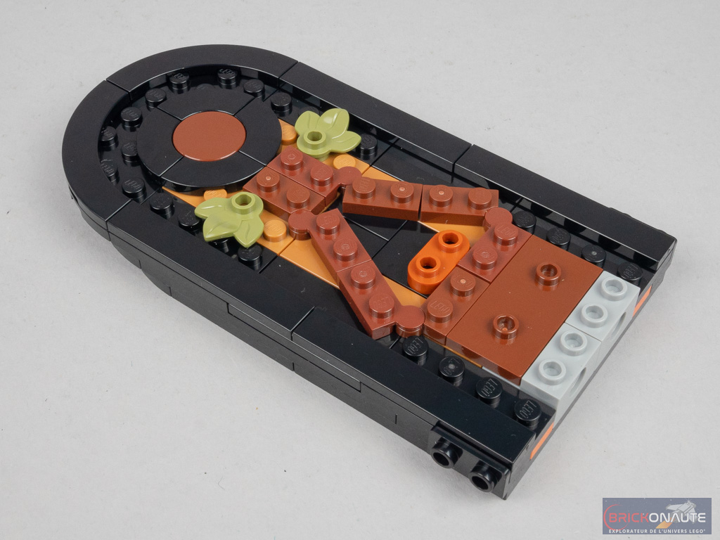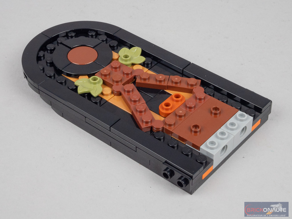 La construction débute par le support de la première moitié de la construction. Rien de bien spécial à mentionner ici : il s’agit de superposer quelques plates et tiles. À l’intérieur, on intègre une plate modifiée de 2×6 tenons pour pouvoir accrocher l’ensemble au mur – une pièce introduite dans la gamme LEGO DOTS en 2022, ce n’est que sa 3ème apparition.