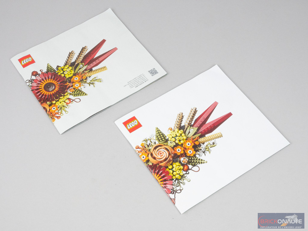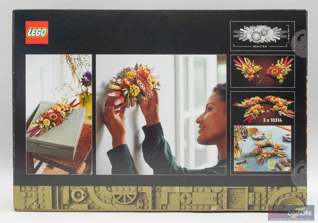 La boîte reprend le look habituel des sets de cette Botanical Collection : le set nous est présenté sur un fond noir, sur la face avant de la boîte, une bande inférieure reprenant les infos principales de l’ensemble. Au dos, de jolies photos nous montrent le set mis en valeur, sur une table et sur un mur. Un schéma nous indique les dimensions de la construction (40 x 13cm), et deux vignettes la possibilité de combiner 3 sets identiques pour former une grande couronne.