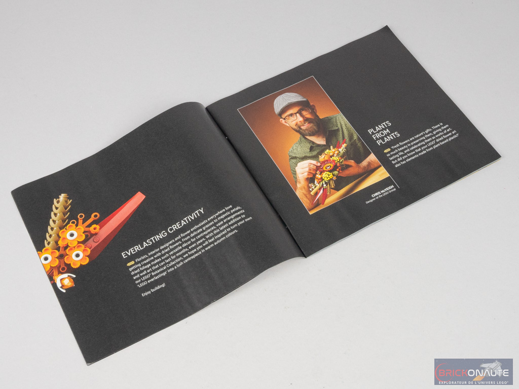 À l’intérieur de la boîte, on trouve 7 sachets de pièces numérotés et deux notices d’instructions – une pour chaque moitié de la construction, on pourra donc la partager avec quelqu’un. La première notice commence par quelques pages de présentation du set et de son designer, Chris McVeigh. Les étapes de construction sont ponctuées de quelques facts relatifs à l’élément en cours de construction.
