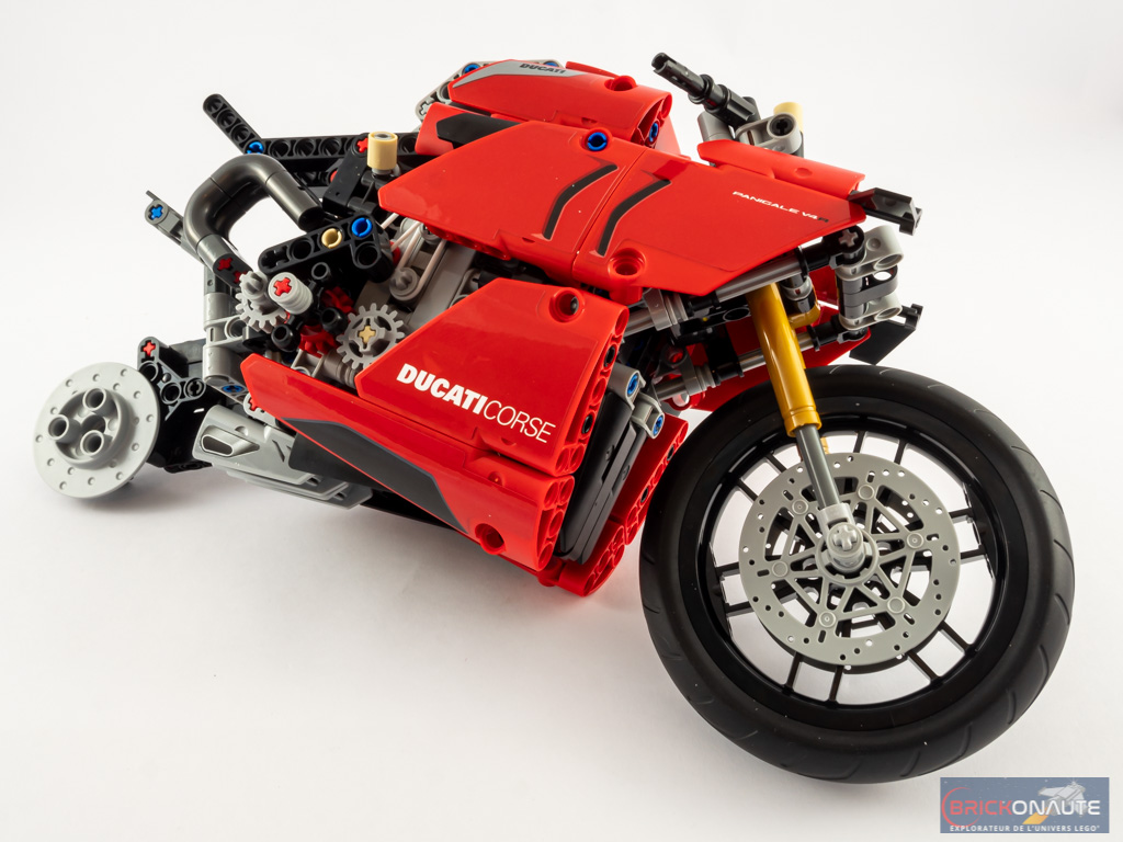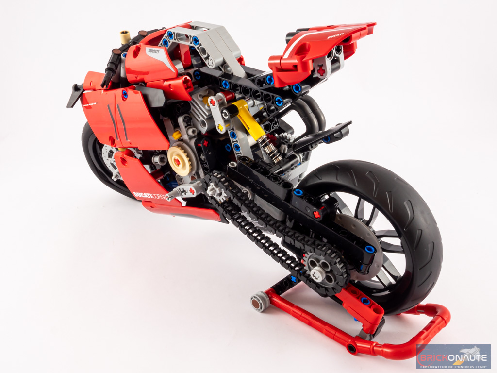 Les proportions sont globalement bonnes, même si la roue arrière peut paraître un peu petite. L’utilisation de pièces spéciales pour les disques de frein et pour les amortisseurs à l’avant sont également très intéressantes. Après, il ne faut pas se mentir : Au niveau de la carrosserie, ça n’a pas grand chose à voir. Les courbes de la sportive italienne étaient sans doute trop complexes à reproduire, mais je pense tout de même qu’il y avait quelques améliorations possibles. La partie basse de notre modèle LEGO est beaucoup trop « vide » et la selle est pour ainsi dire inexistante. La partie grise du réservoir est également plutôt étrange. Tout n’est pas à jeter, mais au rang du design la moto héritera d’un « peut mieux faire ».