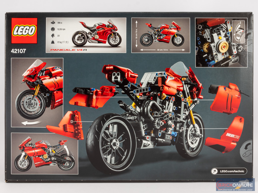 Sur la face avant de la boîte, la moto est sur son stand dans la pitlane d’un circuit dont on aperçoit les tribunes en arrière-plan. Sur l’un des côtés, un petit hologramme nous assure qu’il s’agit d’un produit sous licence officielle Ducati. Au dos de la boîte, une vue éclatée nous permet de voir ce qui se cache sous la carrosserie. Quelques vignettes nous présentent les principales fonctionnalités du modèle. Une photo de la vraie moto nous indique également certaines de ses caractéristiques : une bête de 221 chevaux pour 172 kg !