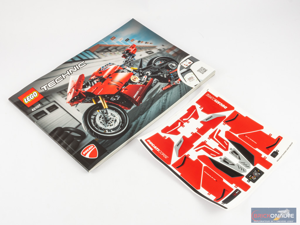 A l’intérieur, nous trouvons 6 sachets de pièces, deux jantes, deux pneus et la verrière souple sous la forme d’une petite feuille de plastique épais. Nous avons également une notice d’instructions de 128 pages pour 208 étapes de construction, et une énorme planche de 19 autocollants.