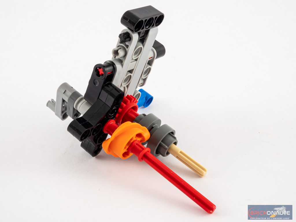 La construction continue avec la boîte de vitesses, par un premier sous-ensemble construit à part que l’on vient fixer dans le cadre. Remarquez le Gear Shifter orange qui, comme son nom l’indique, permettra d’engager un engrenage d’un côté ou de l’autre et le rapport de la boîte de vitesse correspondant. On complète cette boîte de vitesses, puis on ajoute le moteur V4 juste au-dessus de celle-ci. On « ferme » alors le cadre et on ajoute les derniers engrenages, et l’élastique qui permet de transmettre le mouvement au moteur.