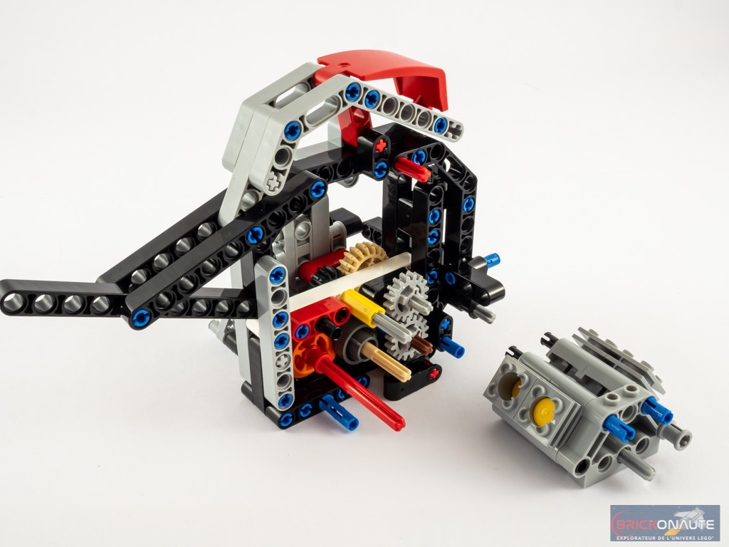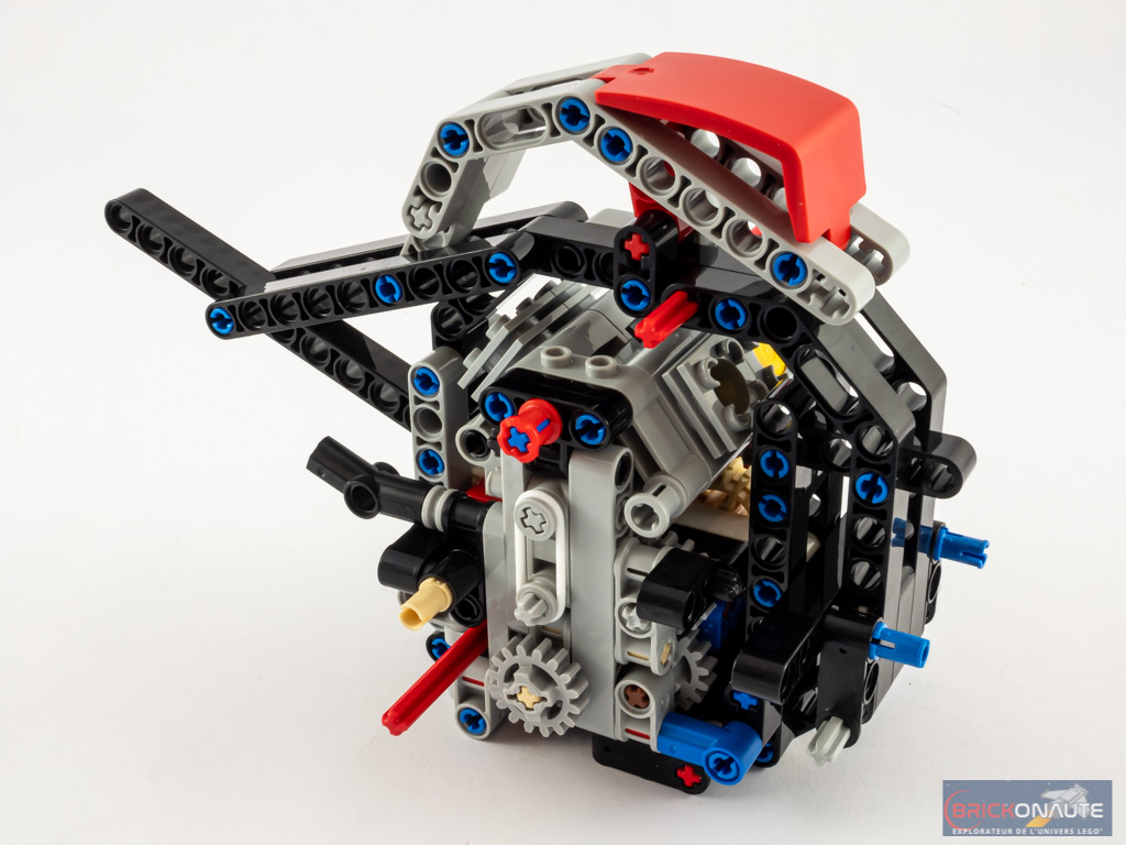 Au rang des fonctionnalités, et LEGO a beaucoup communiqué sur ce point, il s’agit de la première moto LEGO à disposer d’une boîte de vitesses. Elle n’a certes que 2 rapports (+ le neutre), mais loger une boîte de vitesses dans un espace aussi réduit est tout de même une prouesse. Comme pour une vraie moto, le premier rapport est en bas, et le second en haut. Le neutre se situe au milieu. Il est assez aisé d’observer le moteur factice et l’effet d’un rapport ou de l’autre en faisant avancer la machine. Un point d’amélioration néanmoins : le mouvement est transmis à ce moteur par l’intermédiaire d’un élastique plutôt que par une roue dentée, je suis assez sceptique sur la durée de vie du système.