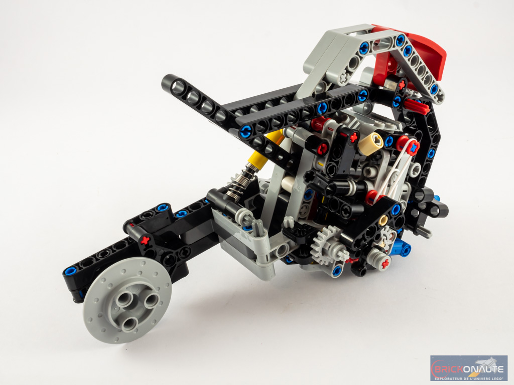 Le bras oscillant et sont amortisseur sont assemblés à part, puis ajoutés à la moto. On termine la boîte de vitesses avec un L Beam retenu par un élastique, qui maintient en place un engrenage (Technic Angular Wheel) et qui permet la sélection de la vitesse depuis la pédale située de l’autre côté de la machine.
