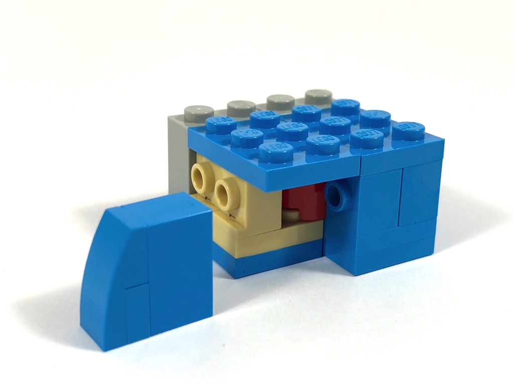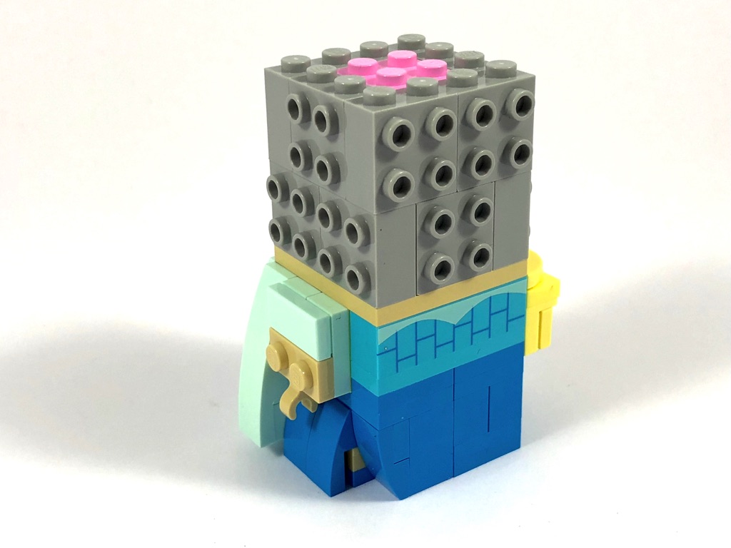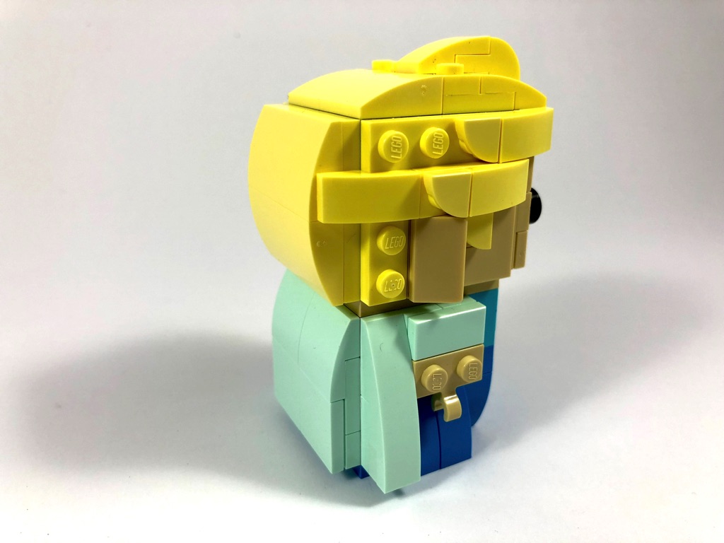 Vous l’aurez compris, il ne reste plus que la tête à construire. Sa structure interne est identique à celles des autres BrickHeadz, avec ses 12 grandes briques SNOT grises. On commence par construire le visage, où l’on notera les deux petites mèches de cheveux dans les coins, avant d’en réaliser la partie haute, mélange asymétrique de slopes de différentes tailles.